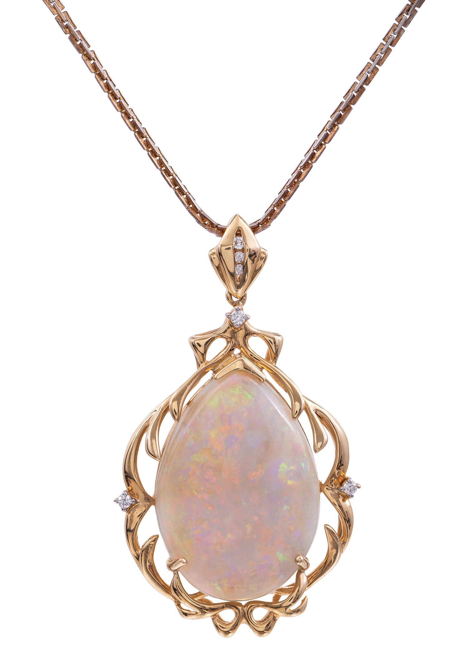 The solid opal of 20.61cts, within a scrolled mount with diamond detail, mounted in 18ct gold.