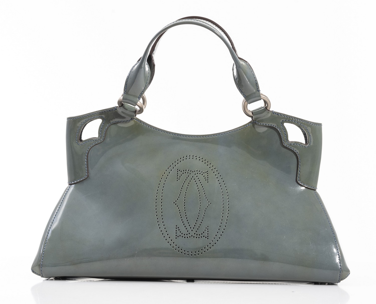 Styled in moss green patent leather with perforated Cartier logo to front, 37 x 21 x 12cm.