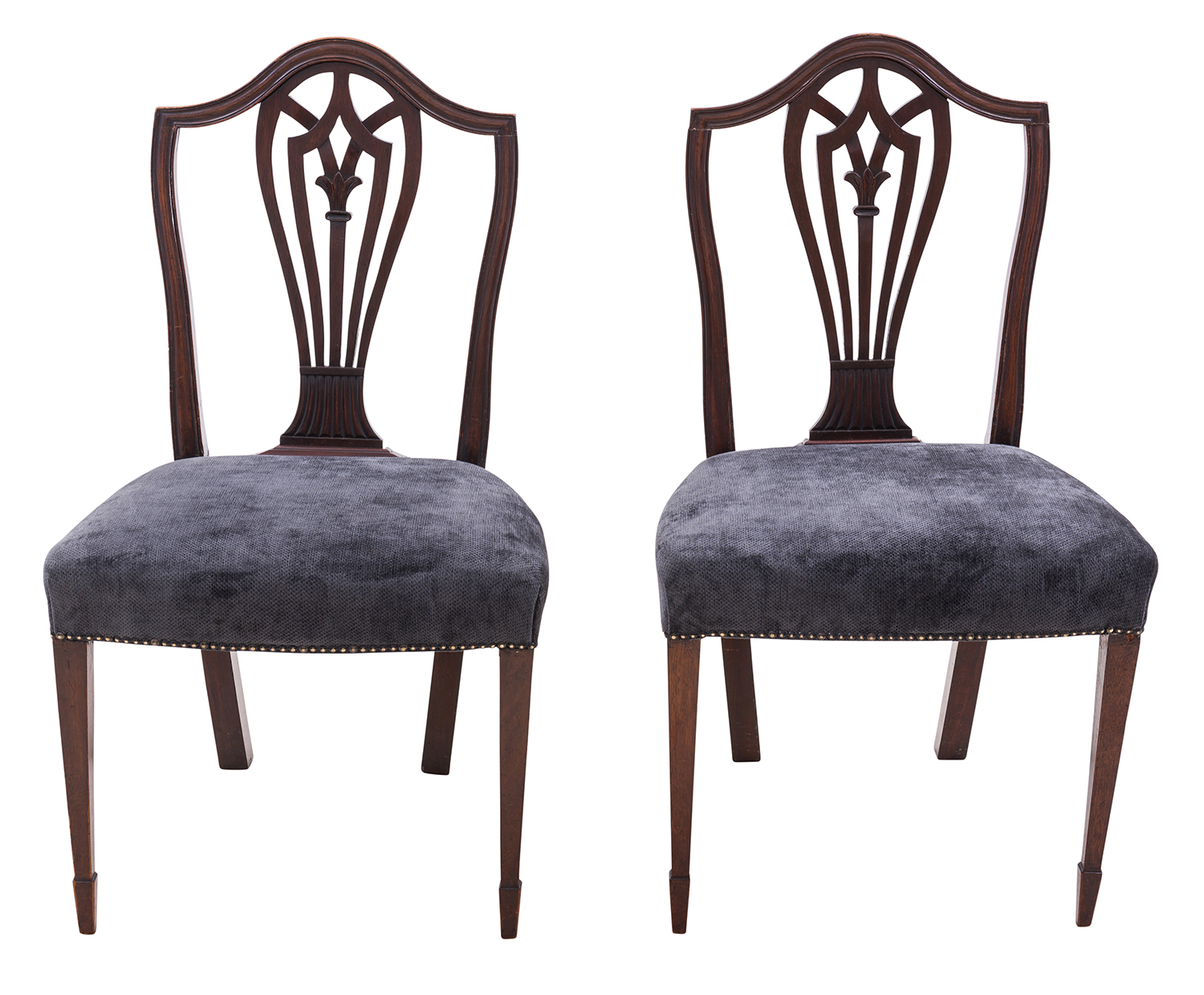 central pierced back splats, recently upholstered velour seats terminating on spade fronted legs