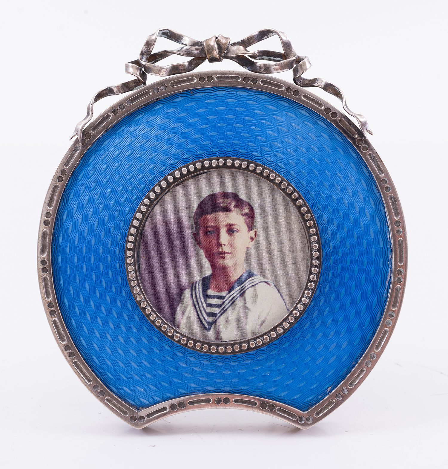 crested with a ribbon design, decorated with an inner beaded rim, 9cm high