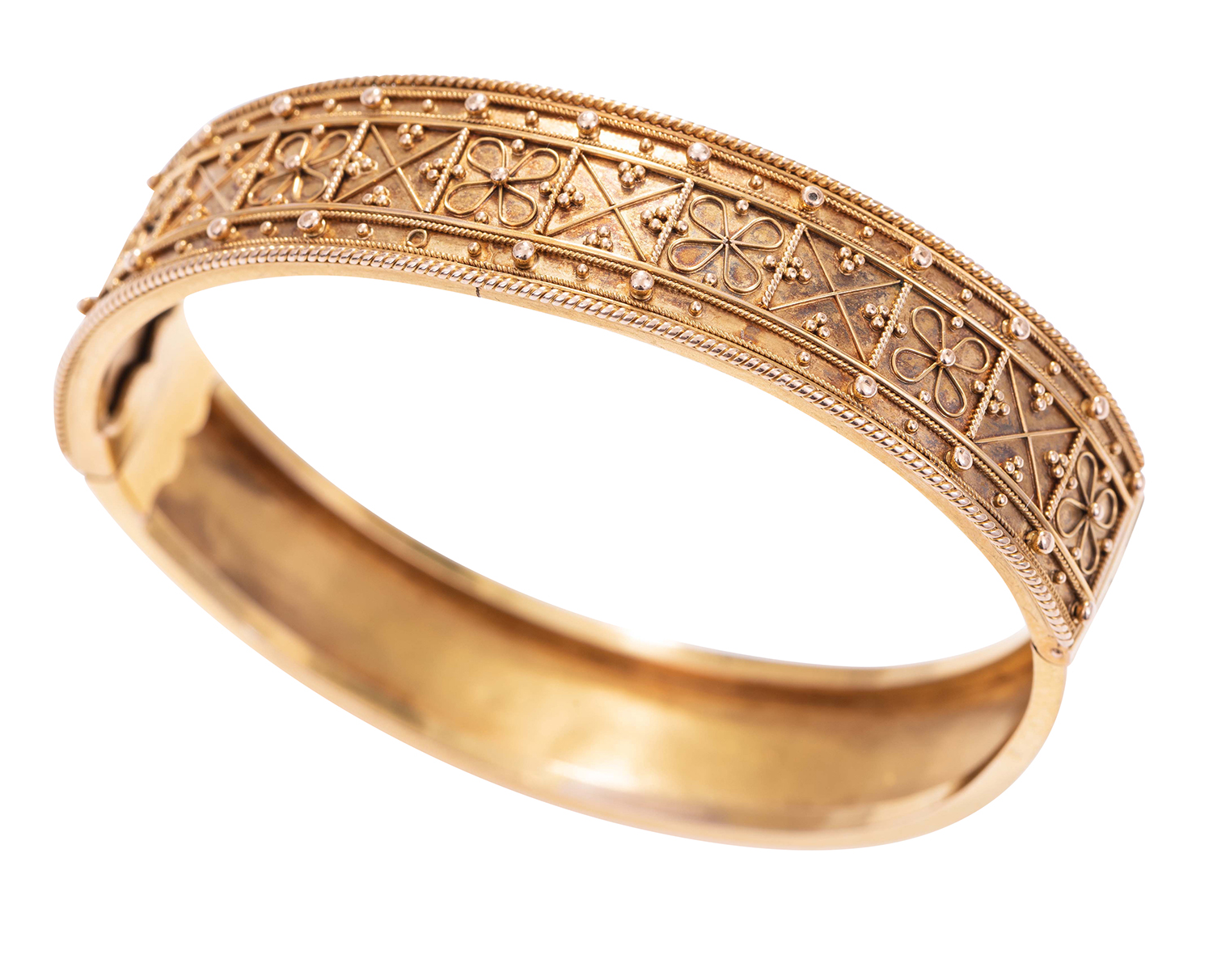The hinged bangle featuring bead and rope decoration, mounted in 14ct gold.