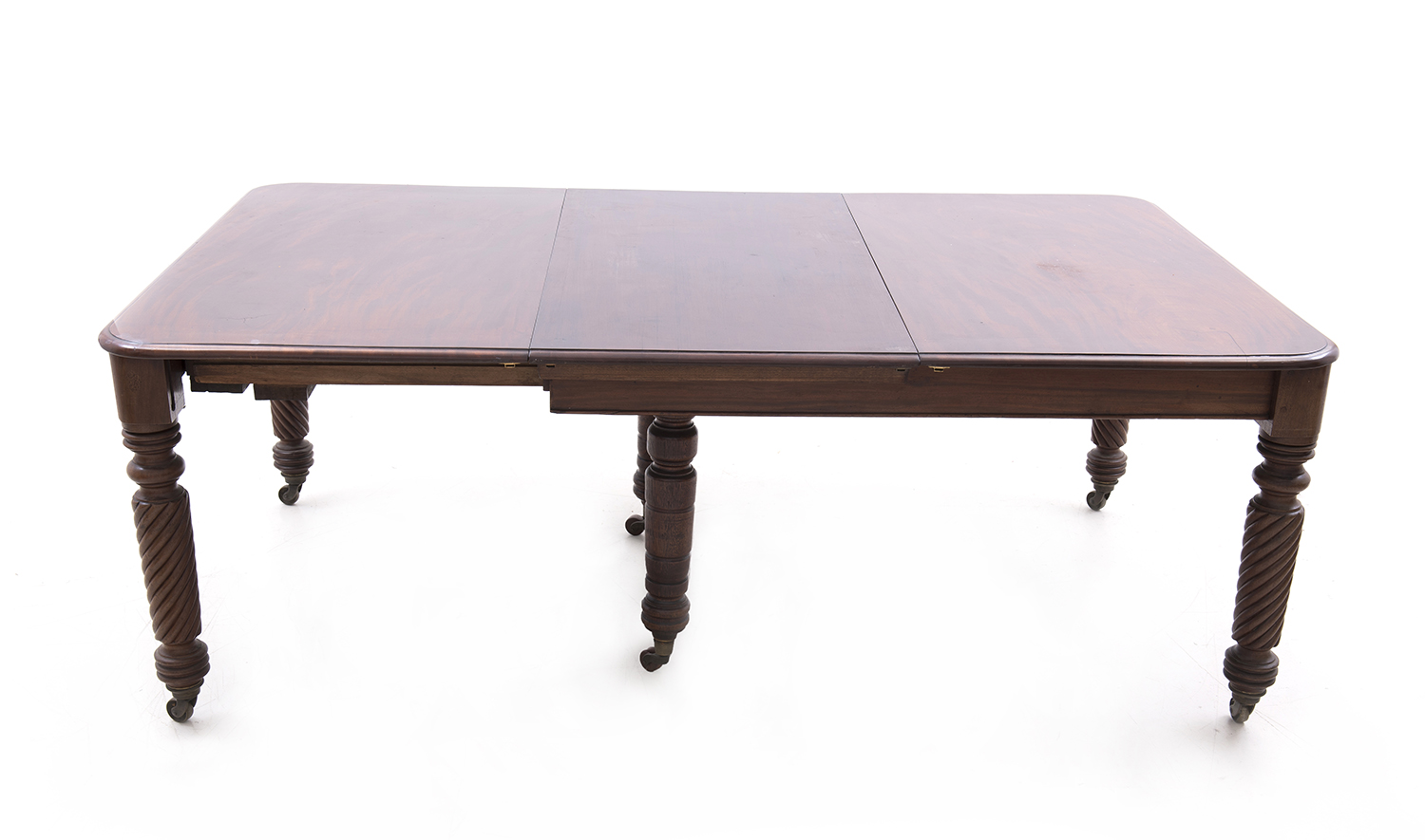 the top with rounded corners and four additional leaves supported by four rope turned legs and two additional central legs for use when extended,