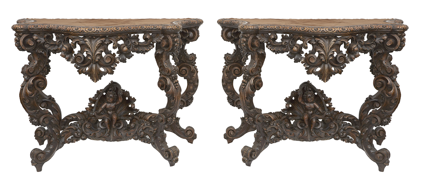 Finely carved with rococo scrolls and ribbon festooned putti, later fabric top, 122 width x 59 depth x 90cm height
