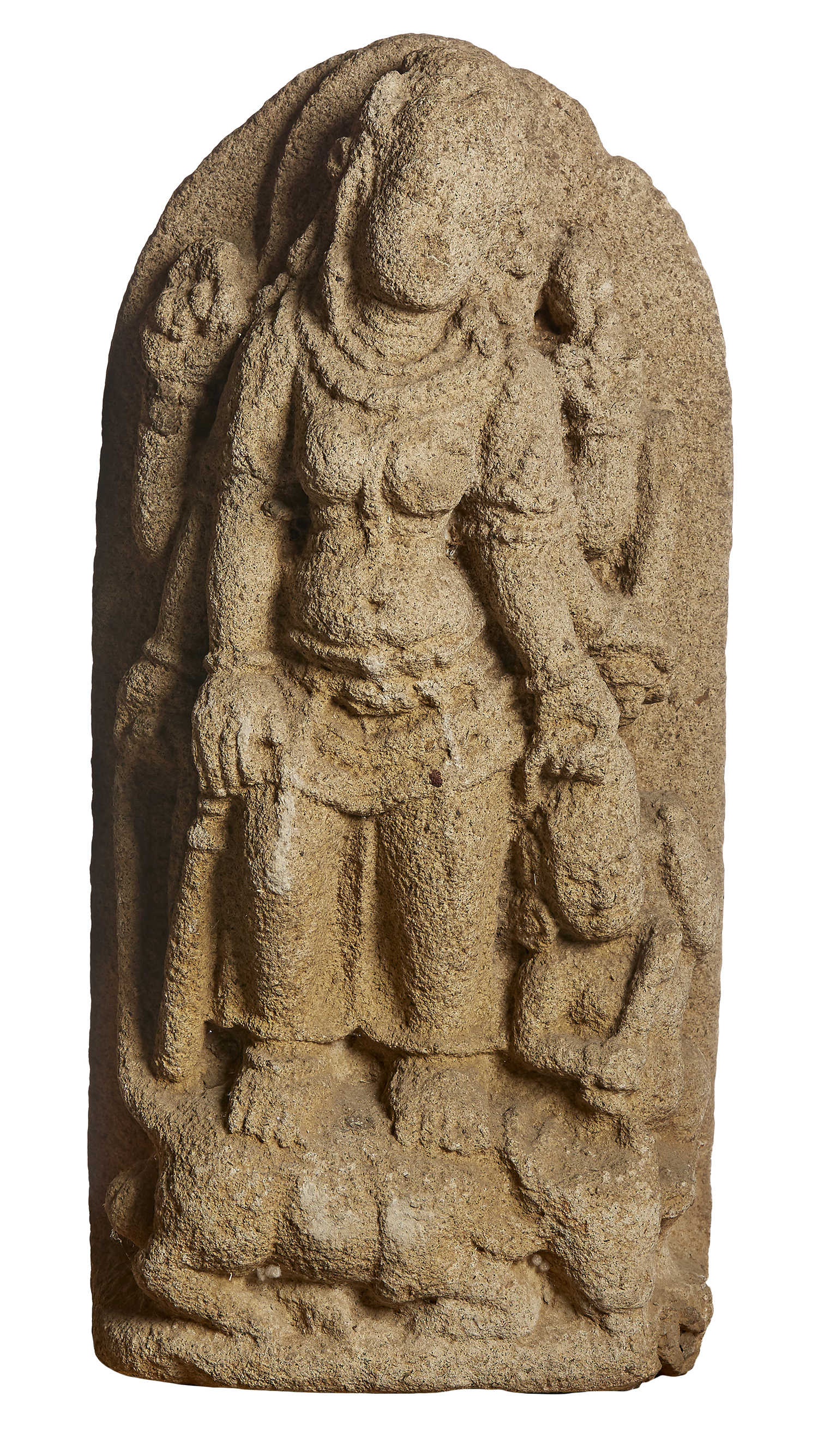 The six armed figure of the Mahishasuramardini/Durga standing on a recumbent water buffalo holding a human figure by the hair. The other five hands holding various attributes, with elaborate jewellery and a dhoti glancing benevolently to one side