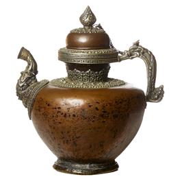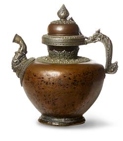 The copper ewer of globular form with repousse silver decoration in the form of stylised lotus petals, with a dragon shaped handle, and a Makara shaped spout, surmounted by an unfurled lotus bud finial