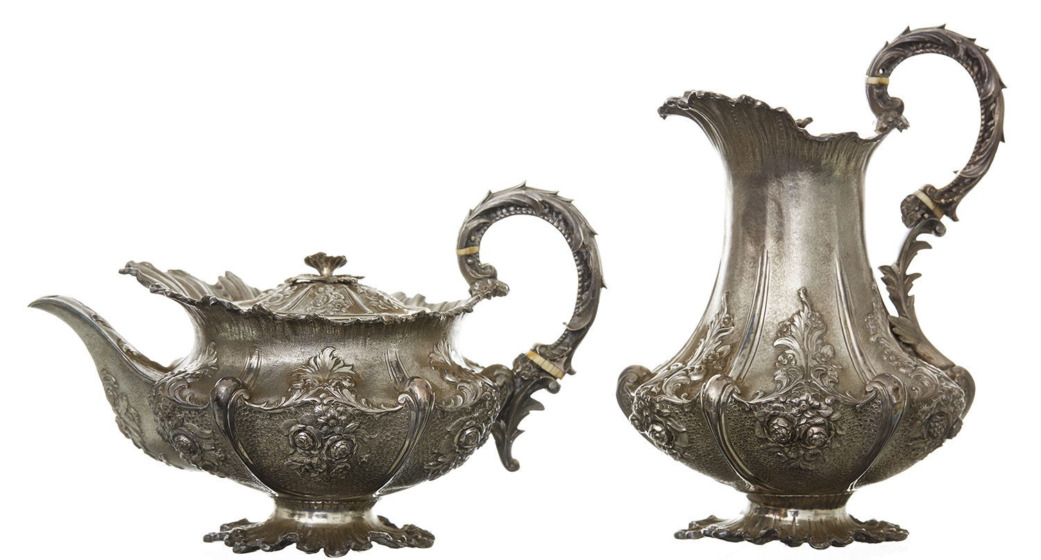 Finely embossed and chased with floral sprays and scrolling designs, 2154 grams, tallest 25cm (2)