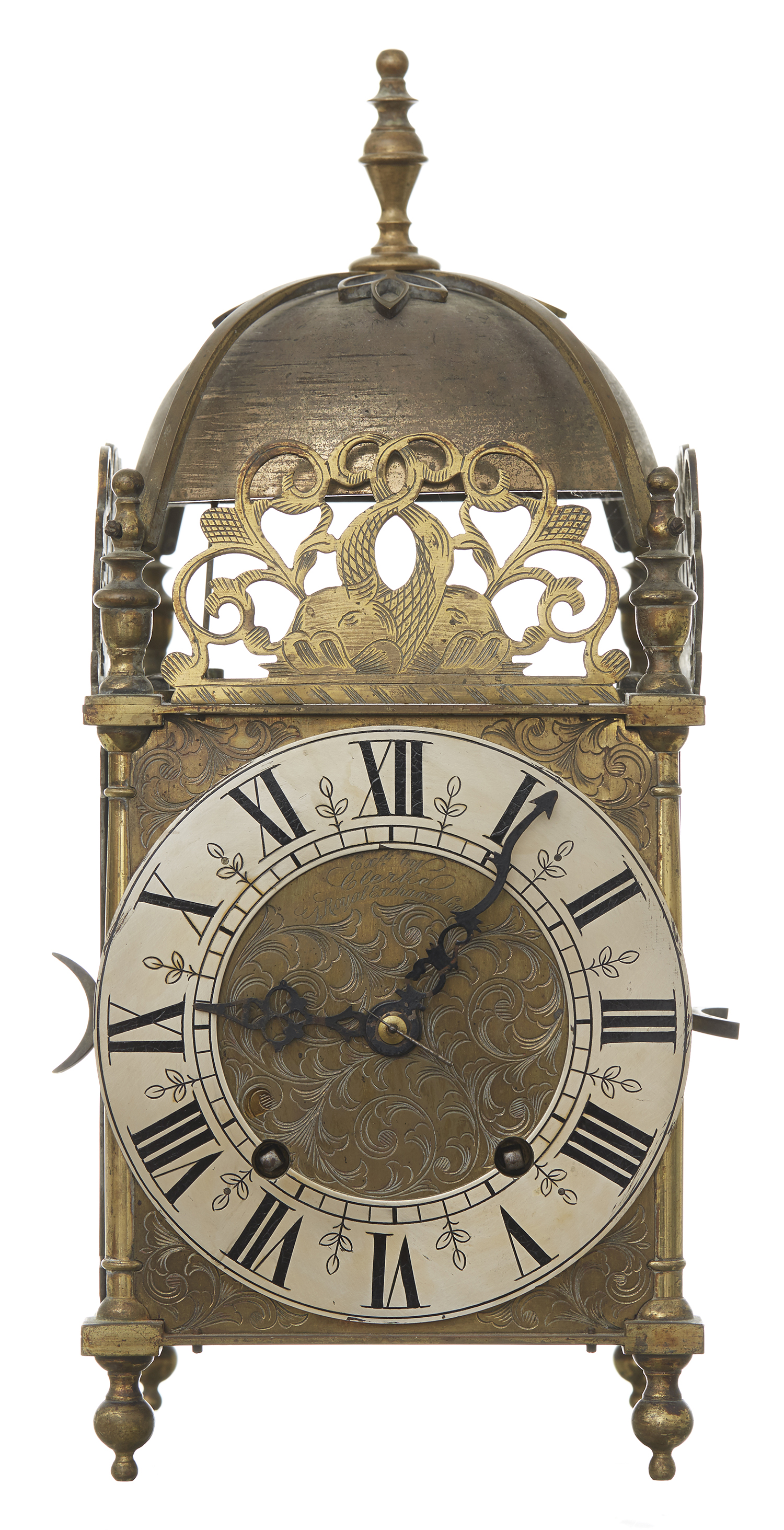 The dome above open cut dolphin pediment, the chased dial with Roman numerals, 35cm high