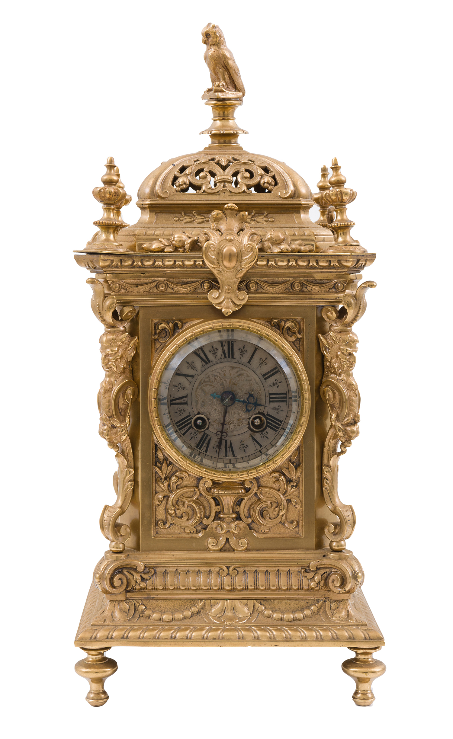 in an ornate brass case crested with an owl finial, the clock face flanked with two caryatids, 44cm high