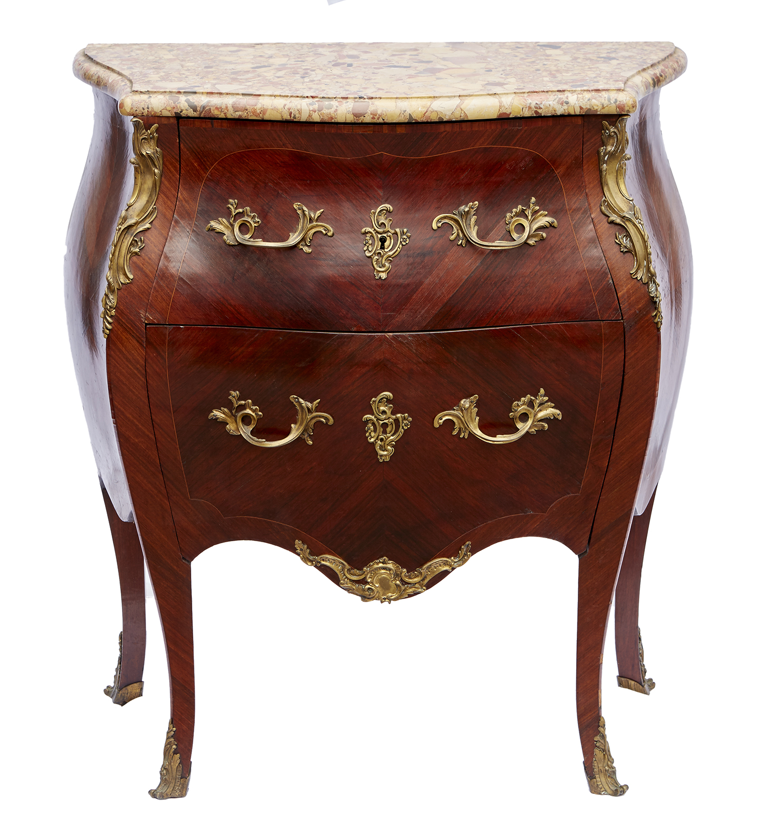 A FRENCH LOUIS XV STYLE MARBLE TOPPED BOMBE COMMODE