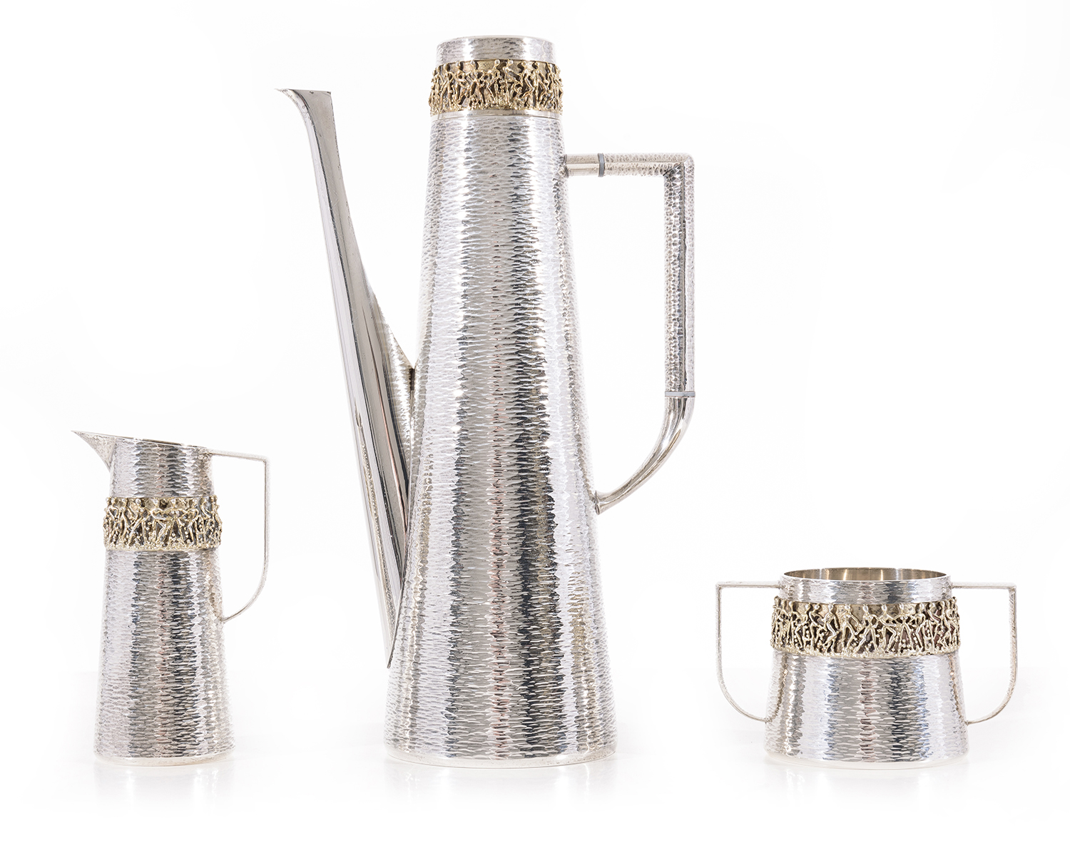 hand beaten, with an applied gilt silver relief band depicting nude figures, approximately 1788 gms silver, tallest decanter measuring 29.5cm high