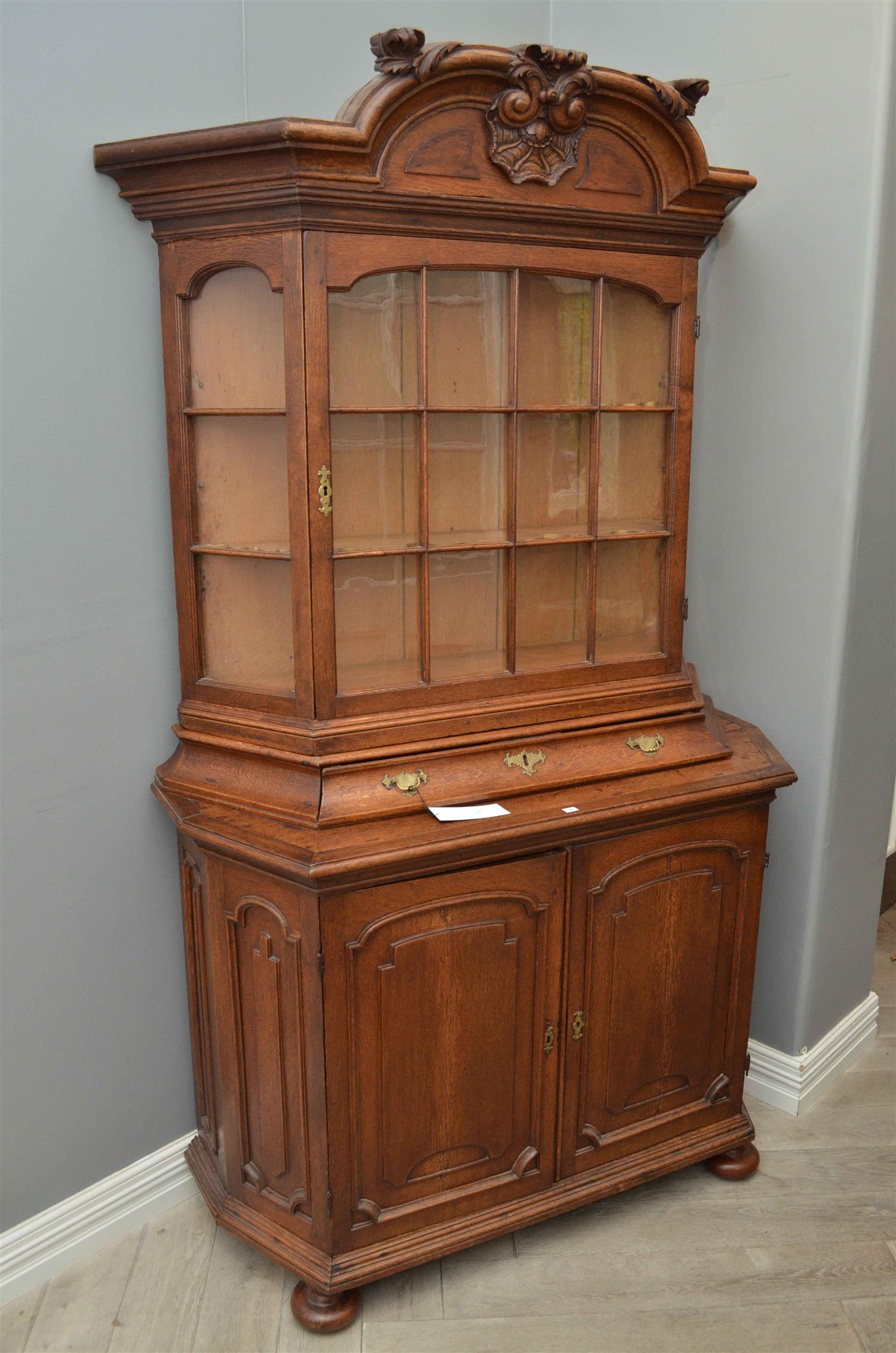 the top section with two astragal doors above a central drawer, and below, a two door cupboard set on bun feet, 217cm high, by 129cm wide and 51cm deep