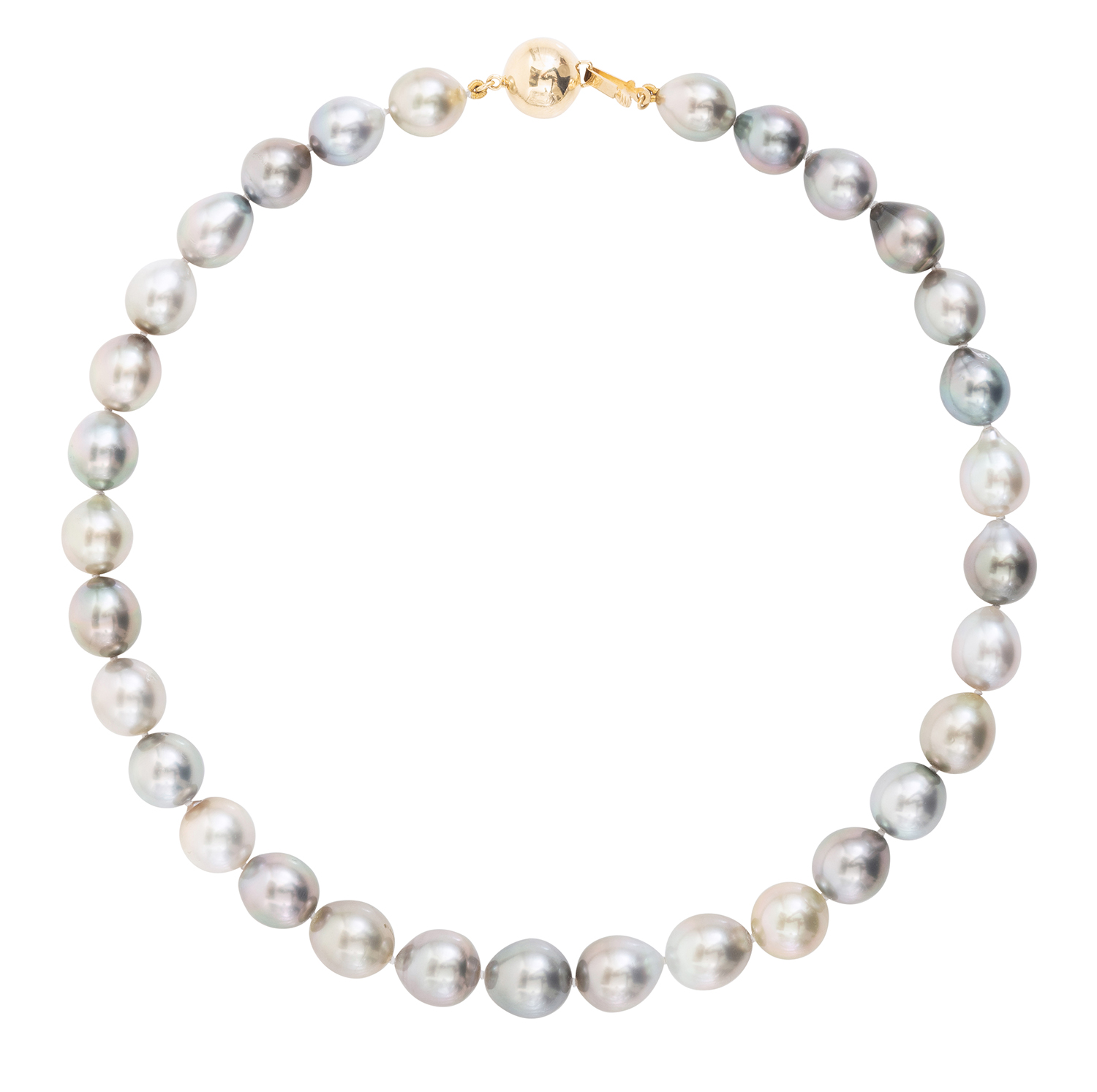 Comprising thirty one baroque pearls of varying hues, measuring 10.3 to 12.1mm, to an 18ct gold ball clasp, total length 420mm.