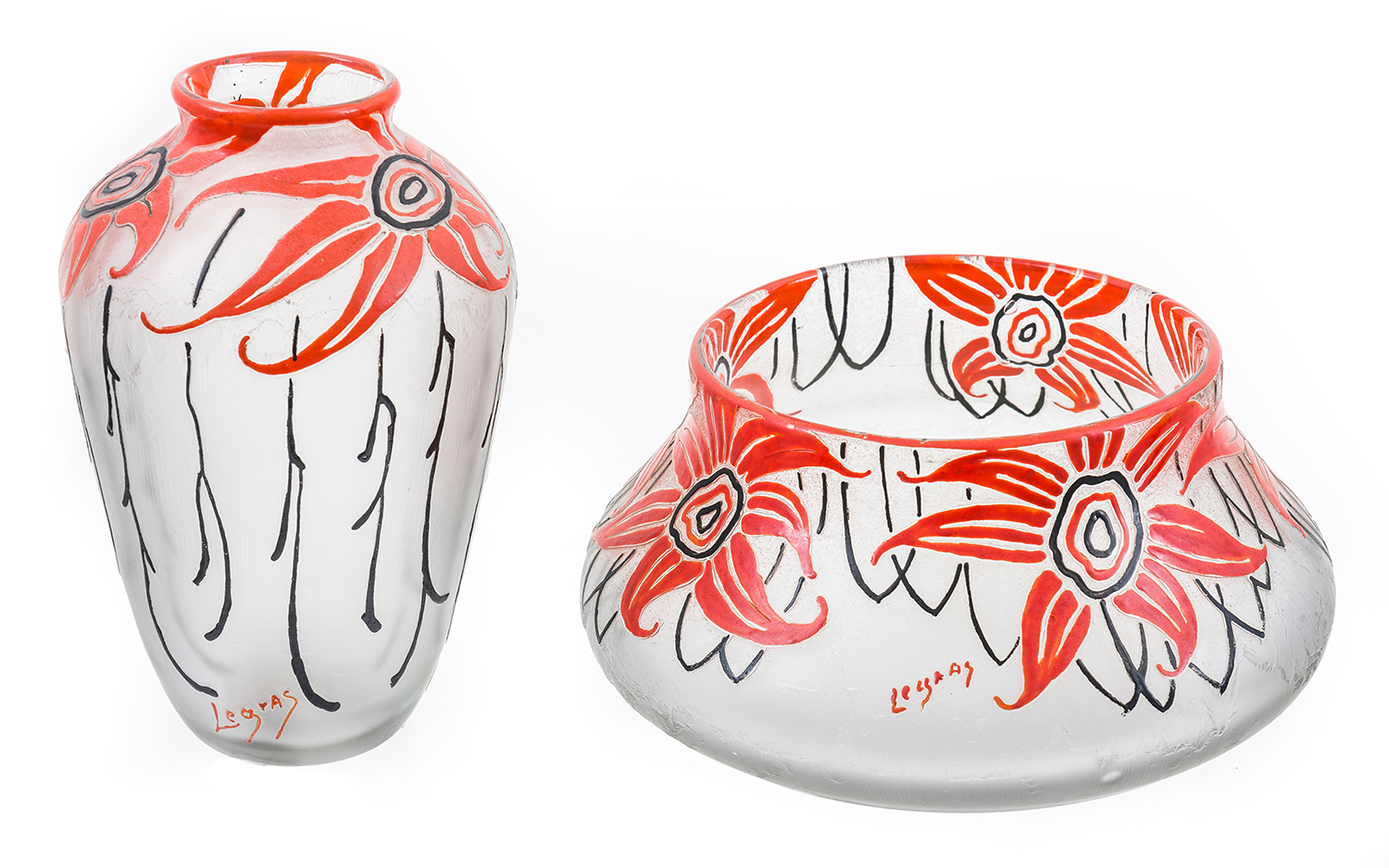 TWO SIMILAR ART DECO PAINTED GLASS VASES BY LEGRAS, CIRCA 1930s