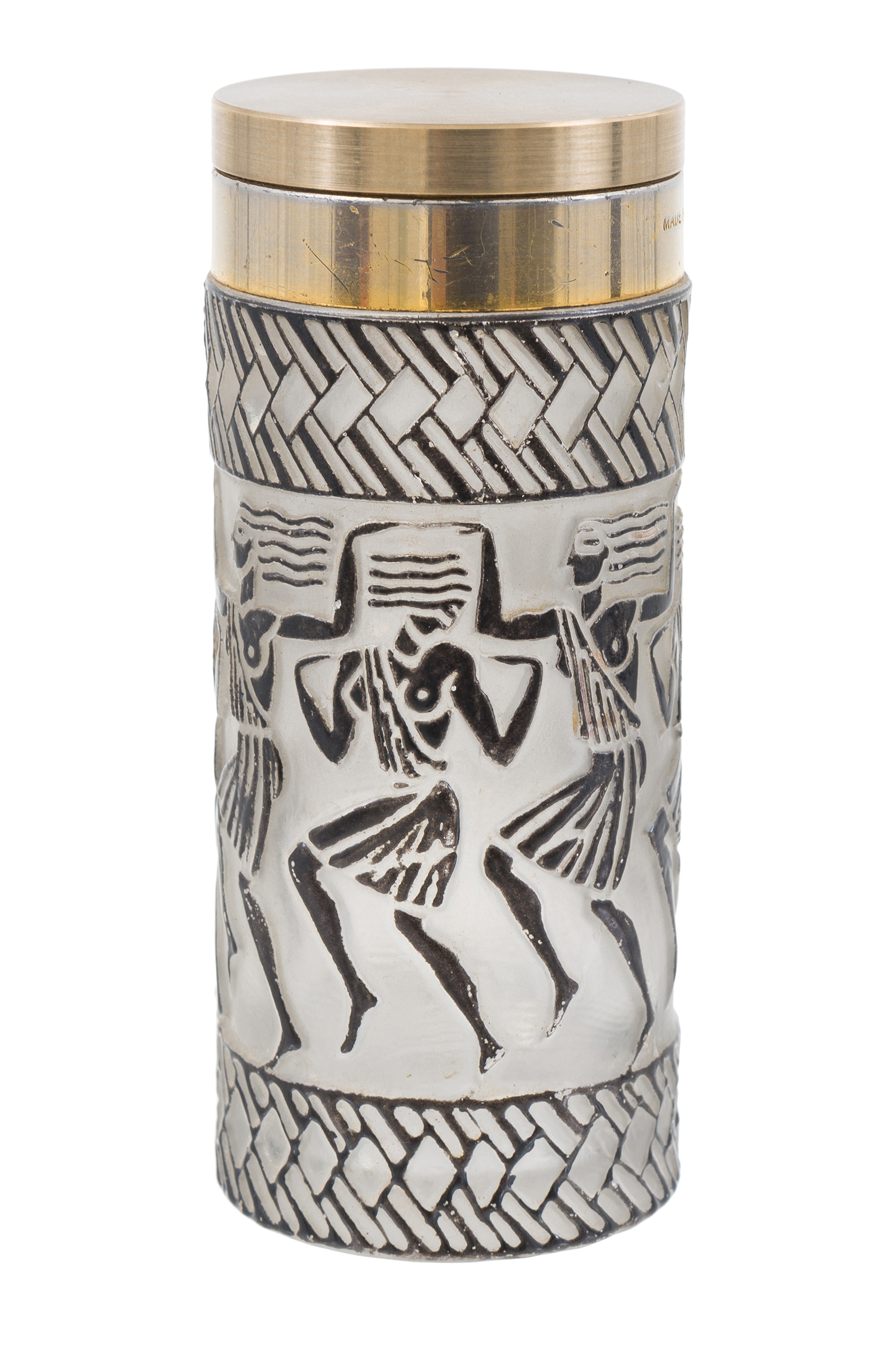 Frosted and stained with a repeating motif of stylised Egyptian dancers, pattern first introduced in1926, marked R. LALIQUE FRANCE approximately 11cm high