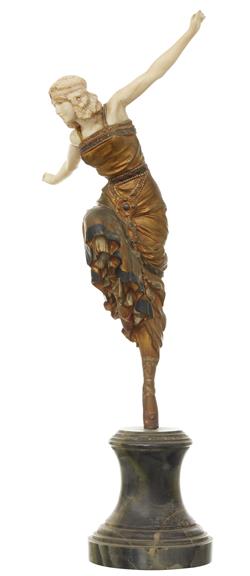 In cold painted bronze and carved ivory, signed to the marble socle base, 44cm high