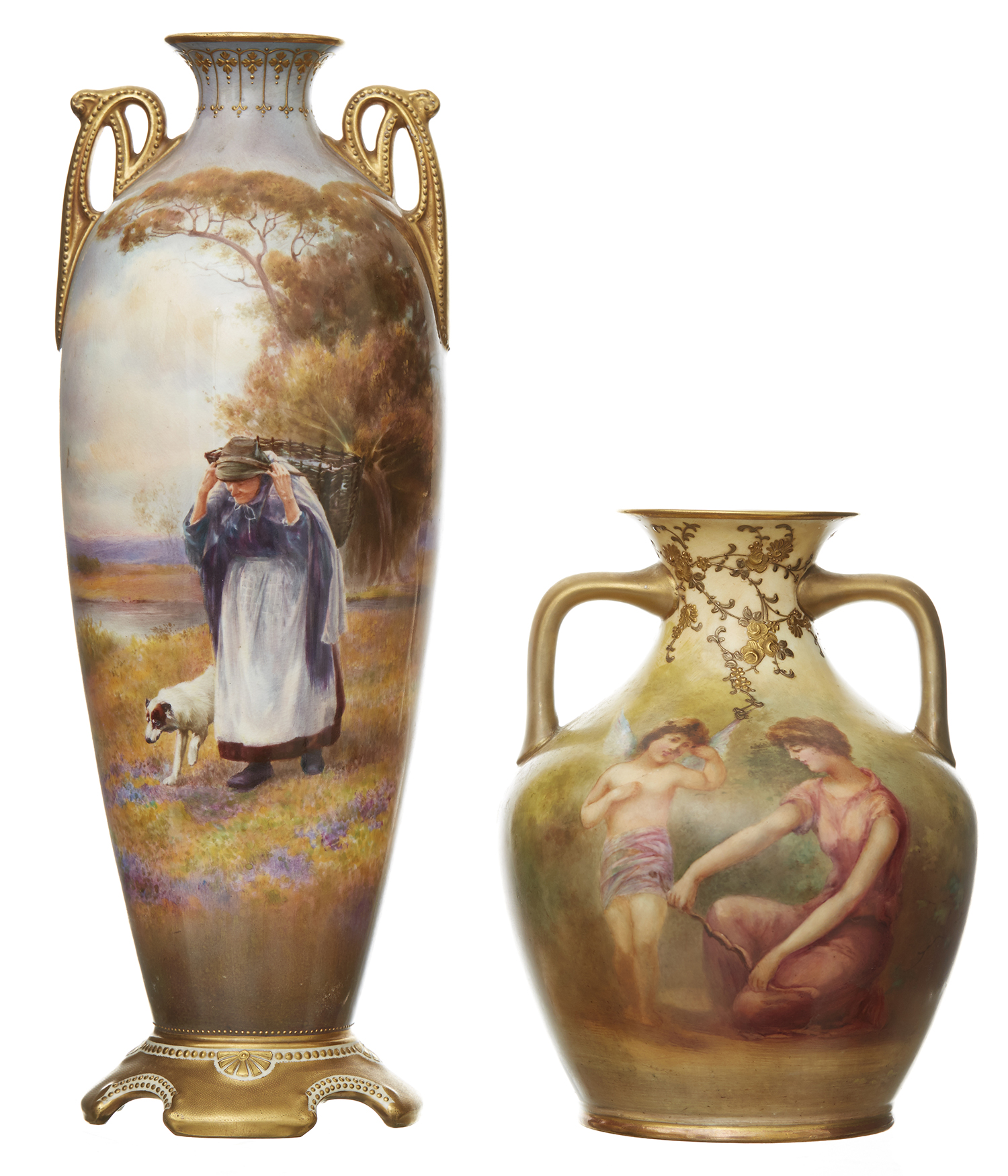 Each painted with figures within a landscape, gilded handles and base, tallest 24cm (2)