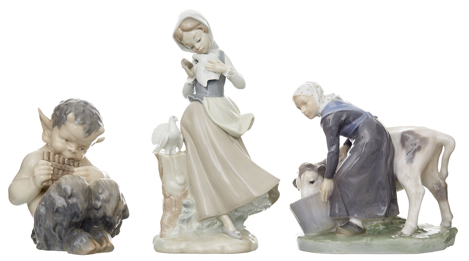 Royal Copenhagen figurine 1786 RC Boy bathing Chr. Thomsen 1916, Girl With Calf #779 and Lladro girl with dove, tallest 24cm (3)