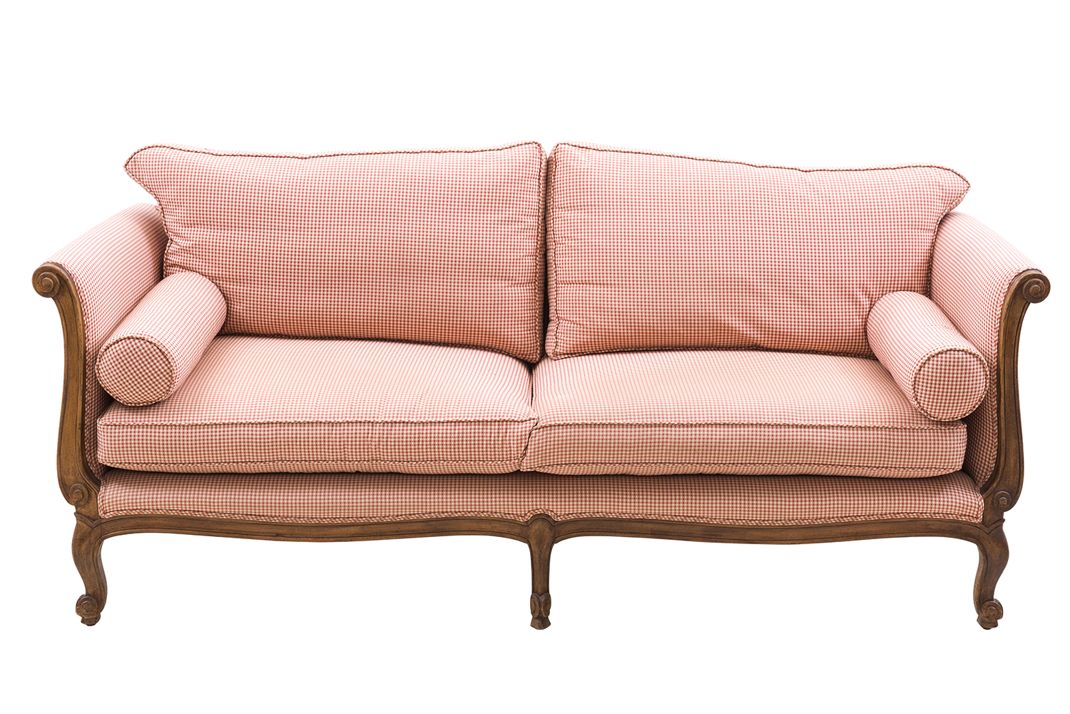 with scrolled arms and legs in walnut, 88cm high by 210cm long and 83cm deep approximately