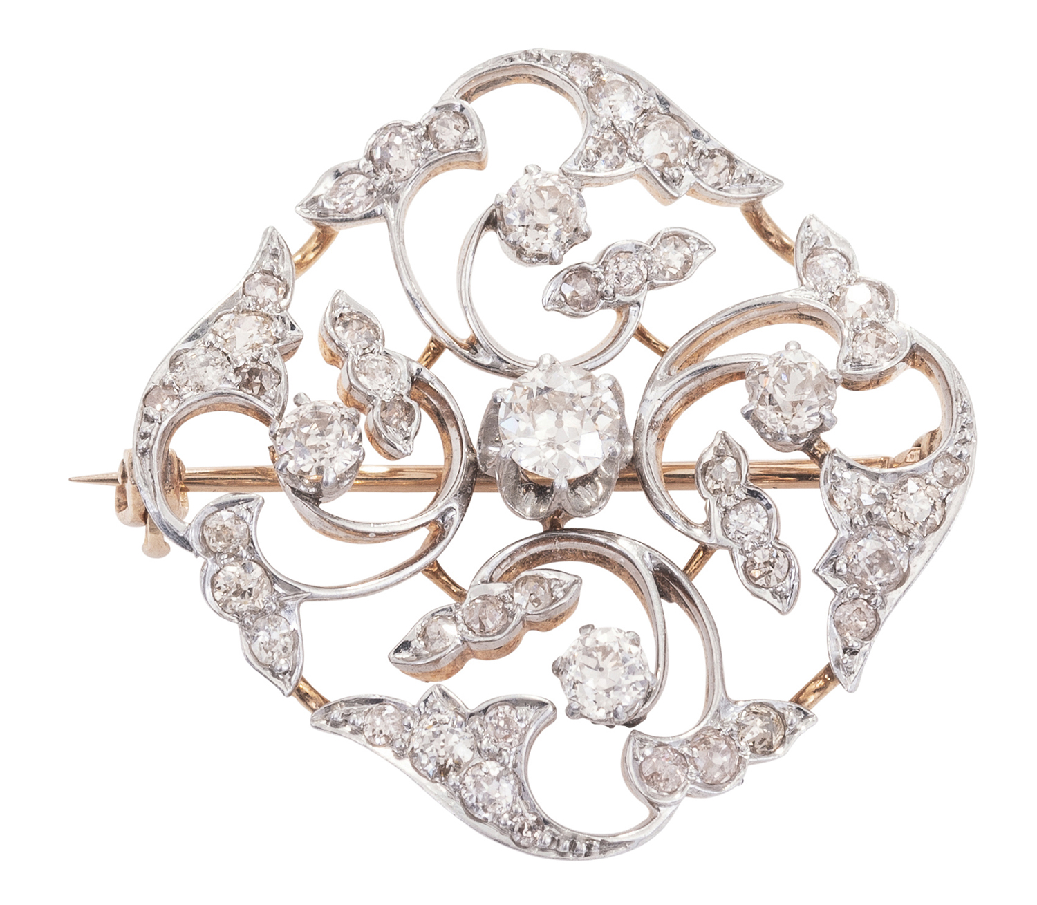 Of pierced foliate design, the brooch set throughout with old European cut diamonds, mounted in 18ct gold and platinum.
