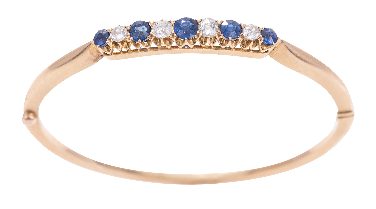 The hinged bangle set with a row of alternating sapphires and old European cut diamonds, hallmarked Samuel Smith & Son Ltd, mounted in 15ct gold.