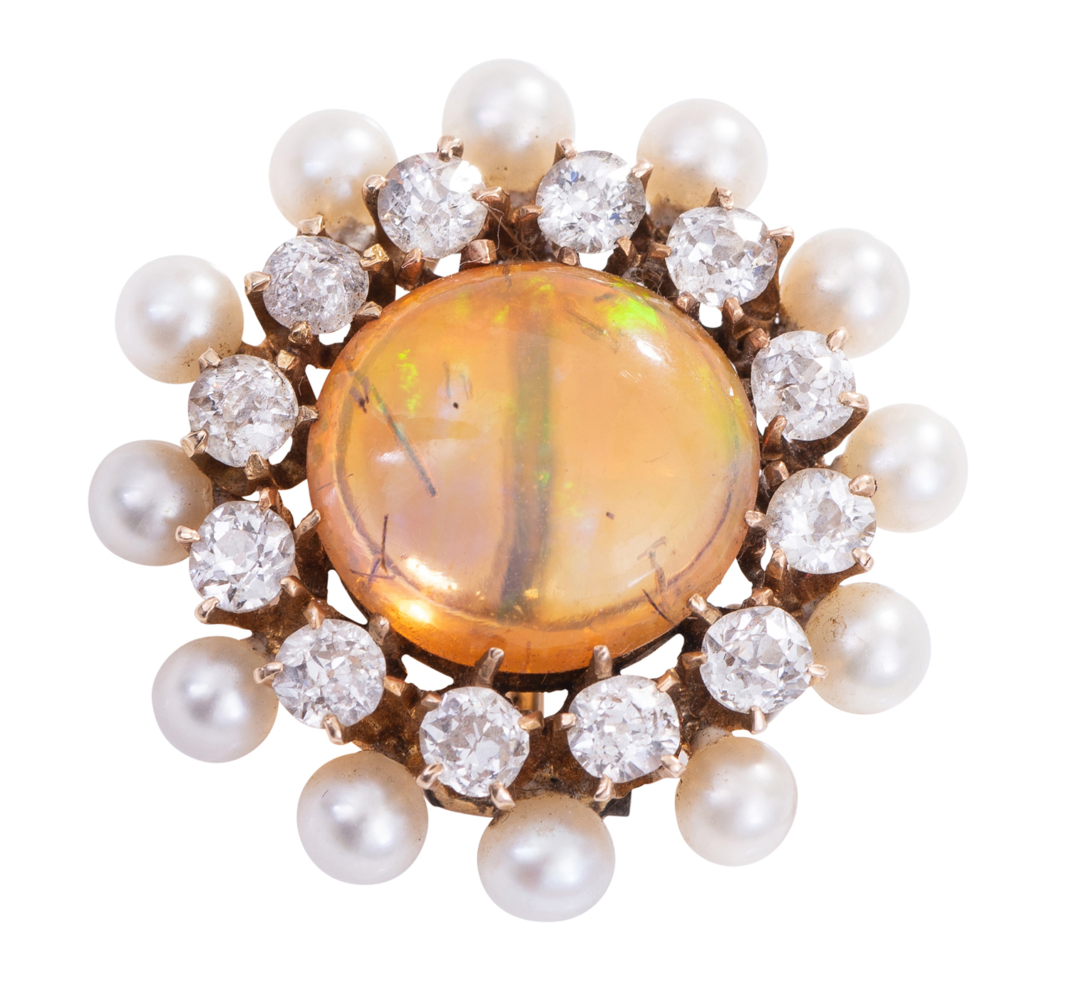 The circular brooch set with a Mexican fire opal cut en cabochon, surrounded by a border of twelve old European cut diamonds, to an outer row of pearls, mounted in rose gold.