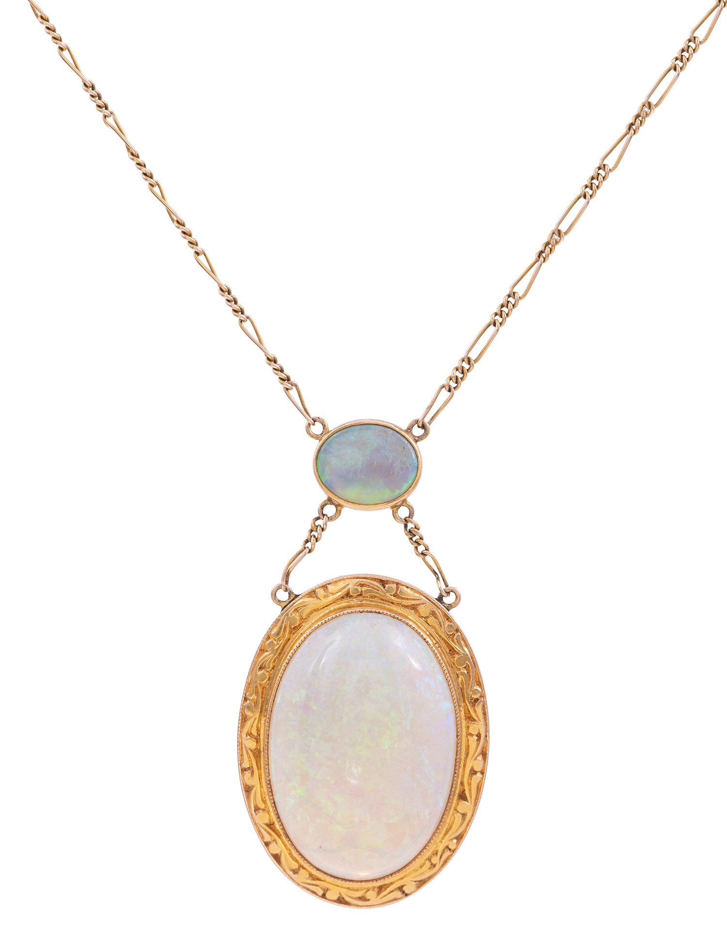 The oval opal cut en cabochon, set within an engraved border, suspended from a further opal, to an integral chain, mounted in 14ct gold, makers mark HC.