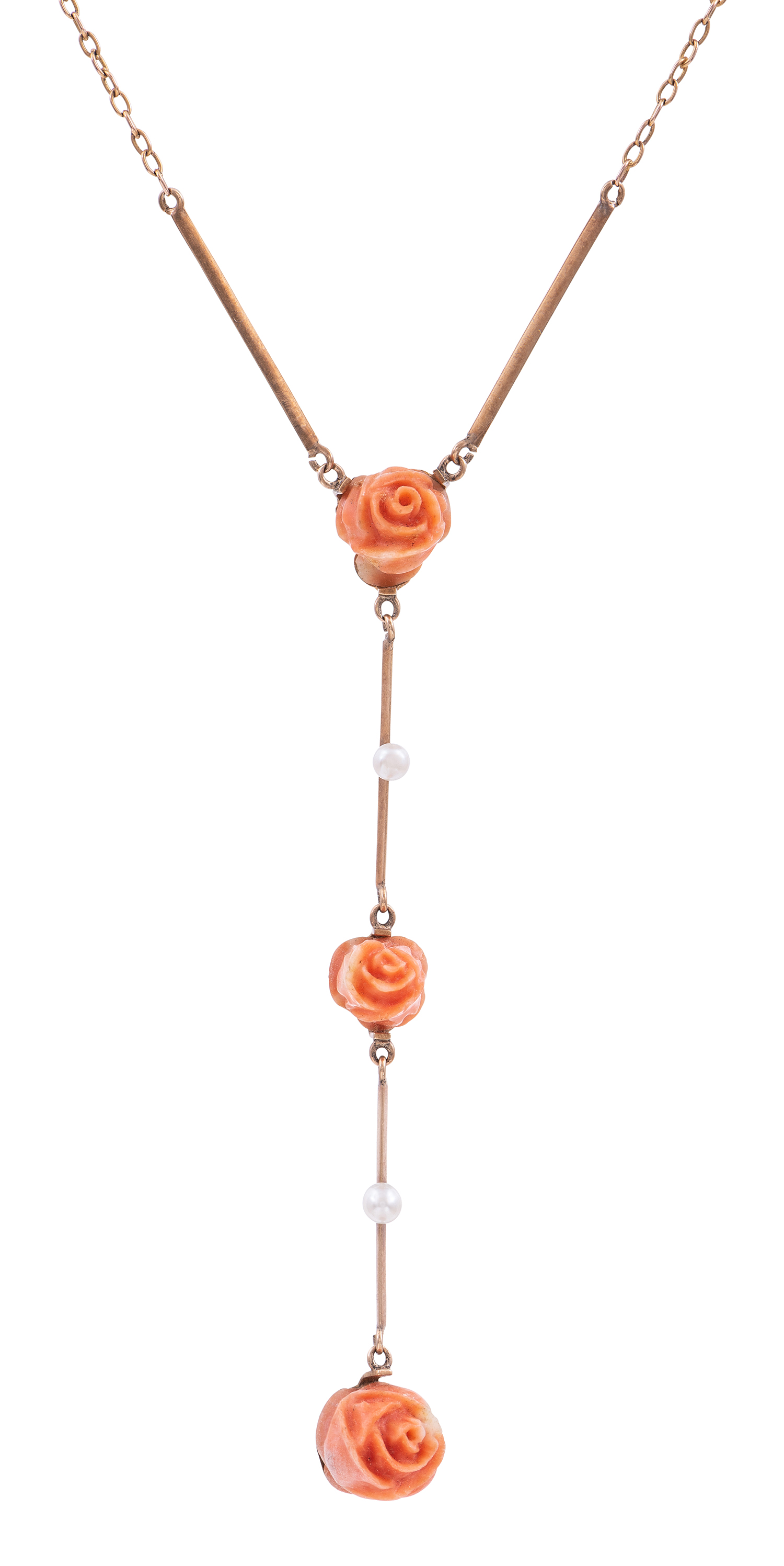 The articulated bar drops set with carved coral flowers and seed pearls, hallmarked Bradshaw, on an integral chain, mounted in 15ct gold.