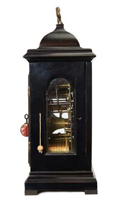 Oak ebonised, fruitwood with inverted bell topped case with brass carrying handle. The glazed side panels with quarter frets to the front door, the moulded base on bracket feet. The glazed back door opening to a rectangular brass backplate engraved with foliate scrolls. The break arch dial with pierced blue steel hands, applied silver chapter ring and spandrels to the corners. Alarm set to centre arbour with calendar aperture below. Signed Thomas- Norris- London to chapter ring. Verge escapement twin barrel and fusee movement, with gut lines and rack striking on bell. Pull repeat mechanism striking on set of six nested bells.