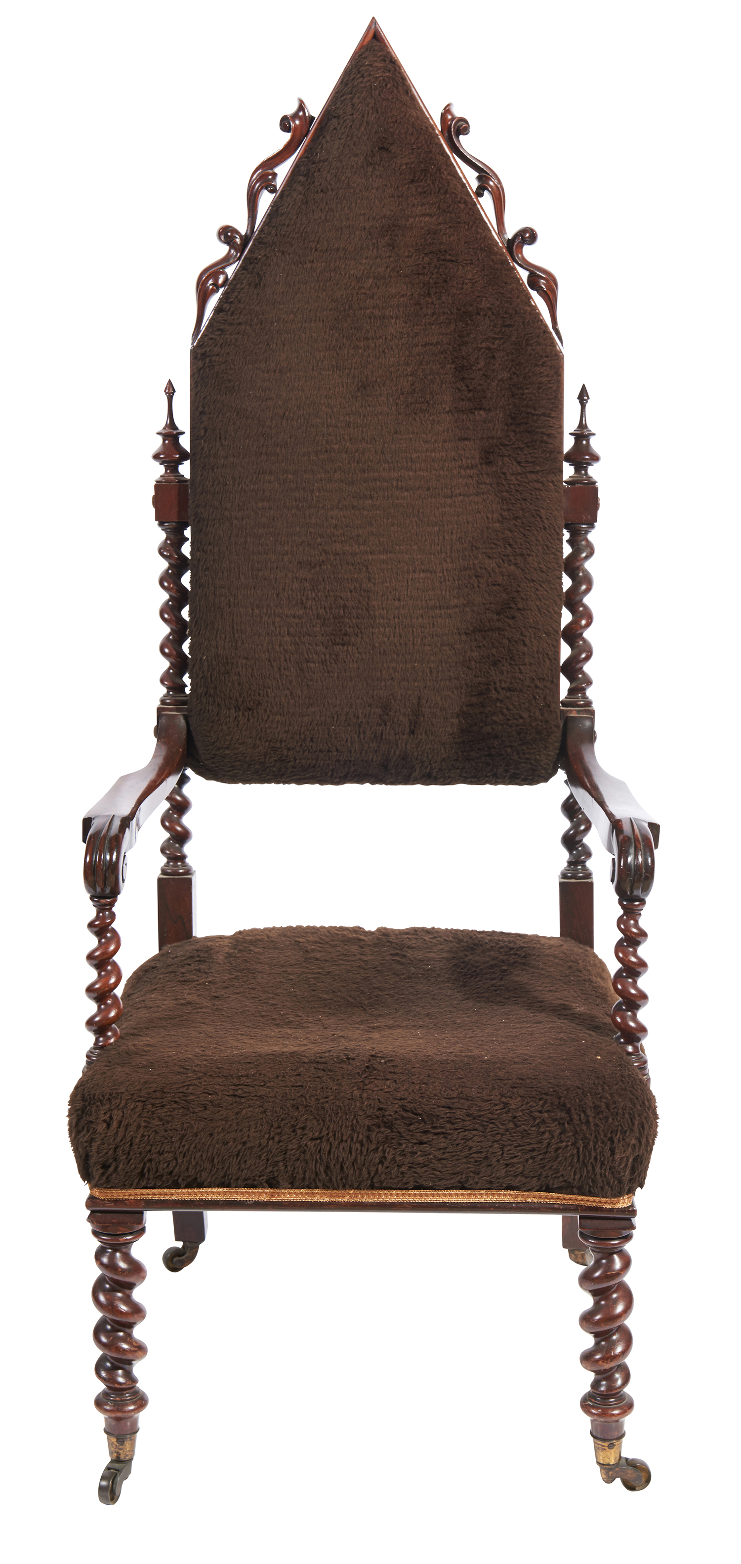 Upholstered in a chocolate brown woolen fabric. The whole nicely decorated with barley twist arm rests and legs, rasied on castors