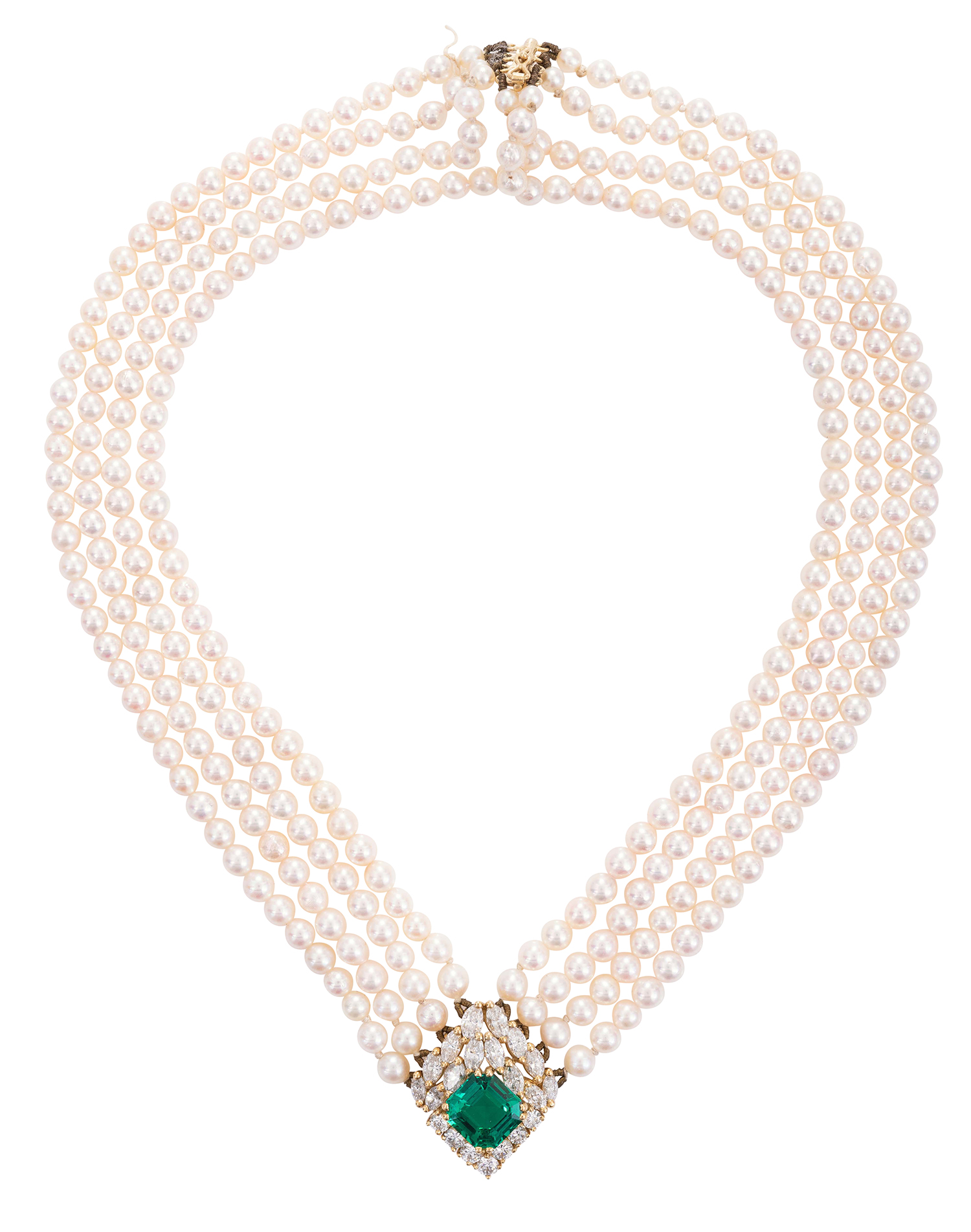 Comprising four strands of cultured pearls measuring 4.3mm, featuring a central Gilson emerald and diamond cluster pendant, in 14ct gold, total length 350mm.