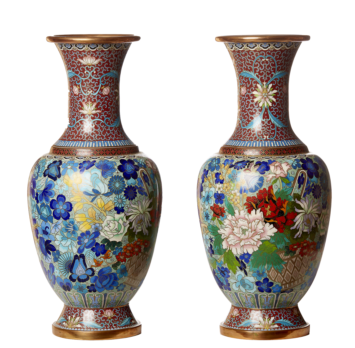 Each depicting a basket of flowers with butterflies to the main body and scrolling lotus to the neck