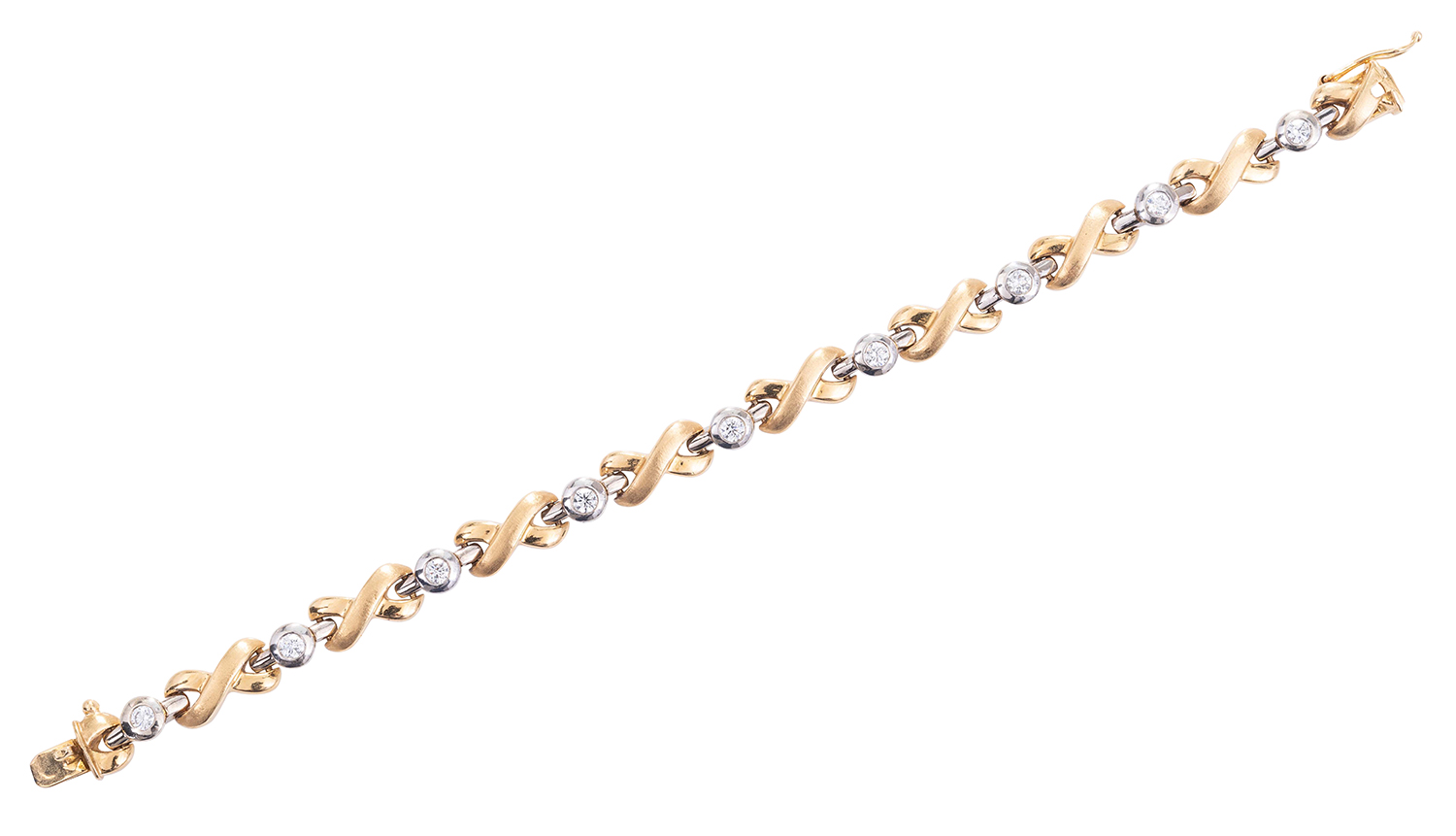 Comprising alternating bezel set diamonds totalling 0.90cts, to satin and polished yellow gold cross link panels, mounted in 18ct gold, total length 180mm.
