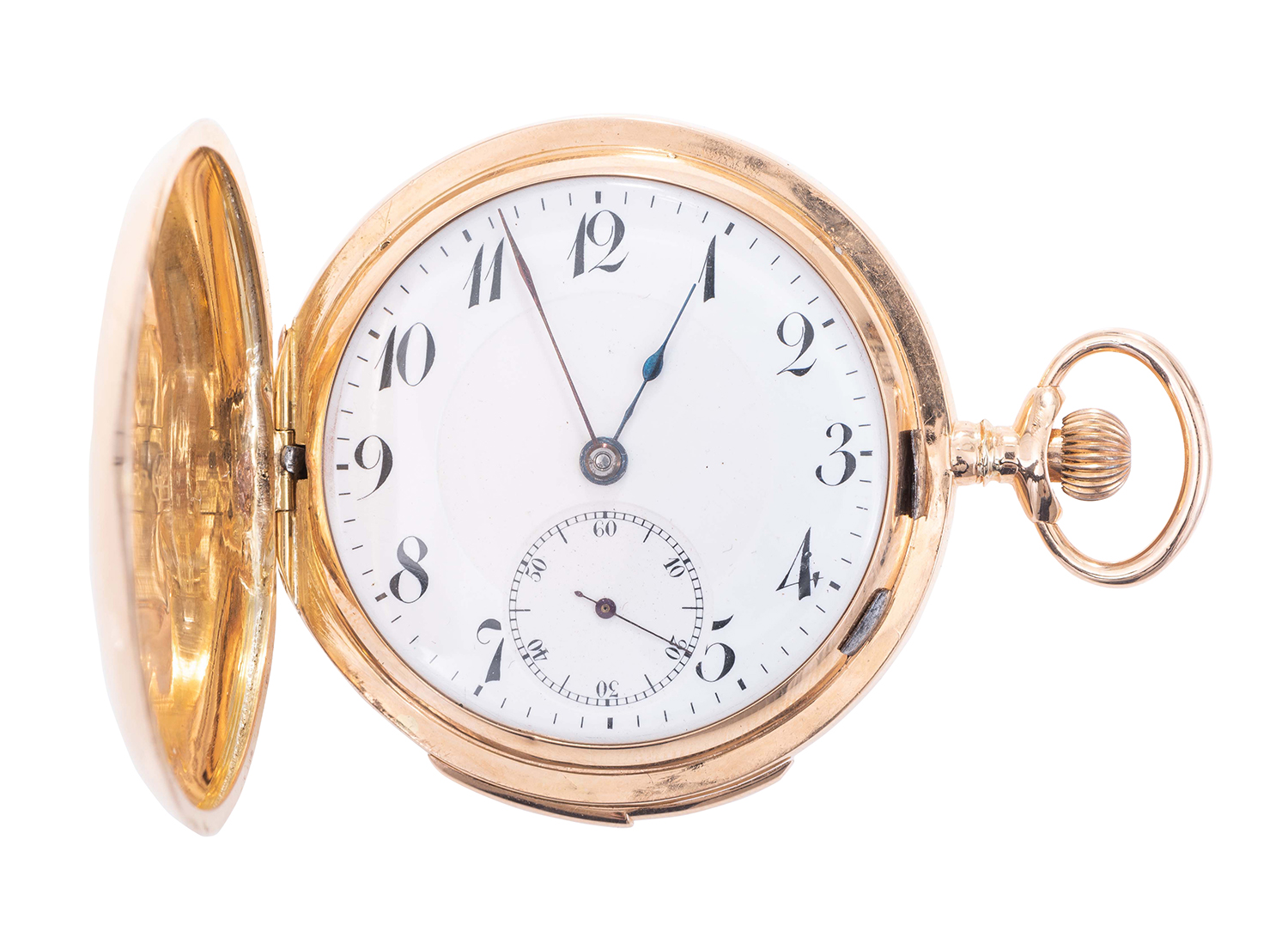 Crown wind and lever set movement, circular white dial with Arabic numerals, subsidiary seconds dial at six, 18ct gold case with engraved intials S.W to the lid, 45mm diameter.