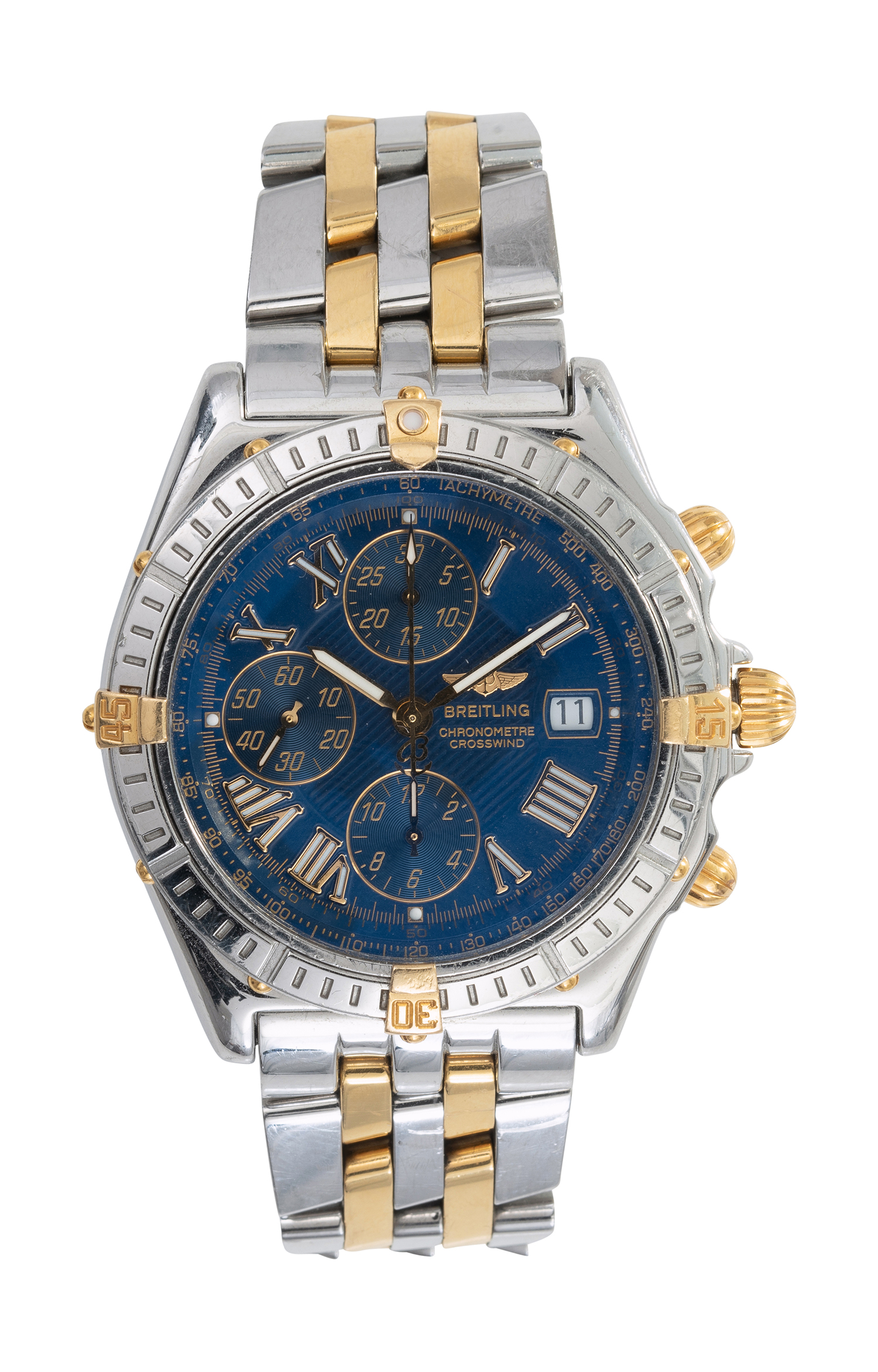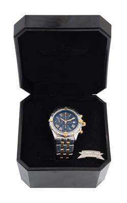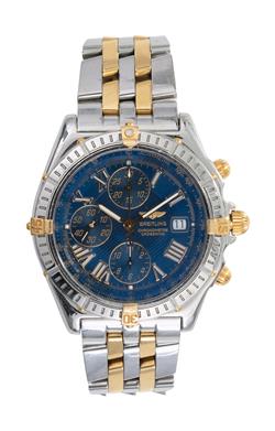 Automatic movement, circular navy blue dial with Roman numerals, date aperture at three, signed case ,dial and movement, stainless steel case with gold detail and conforming bracelet bands, reference number B1335512.C510, serial number 280542, 40mm diameter, boxed with papers.
