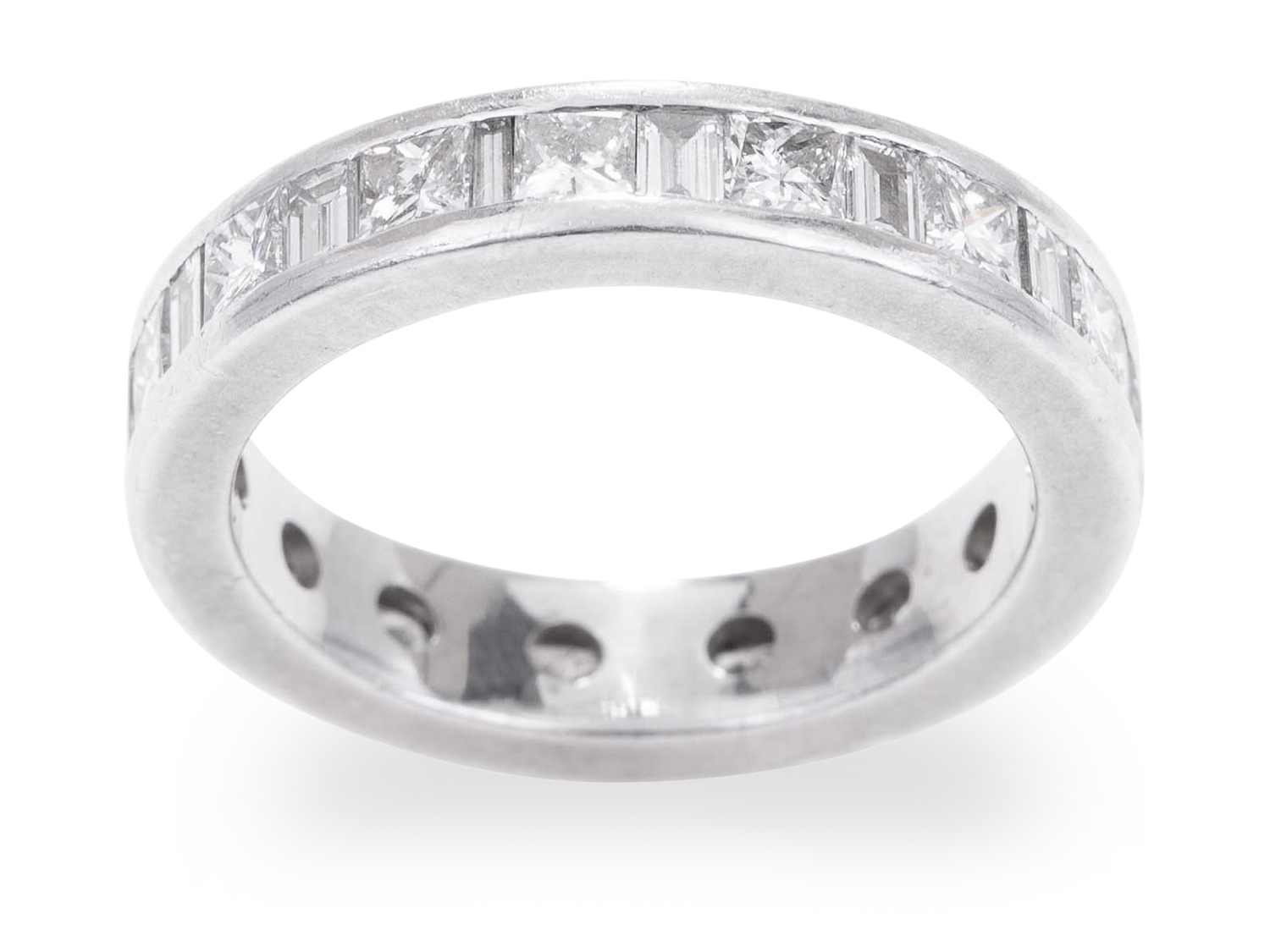 Comprising baguette and princess cut diamonds totalling 1.25cts, mounted in platinum, ring size M.