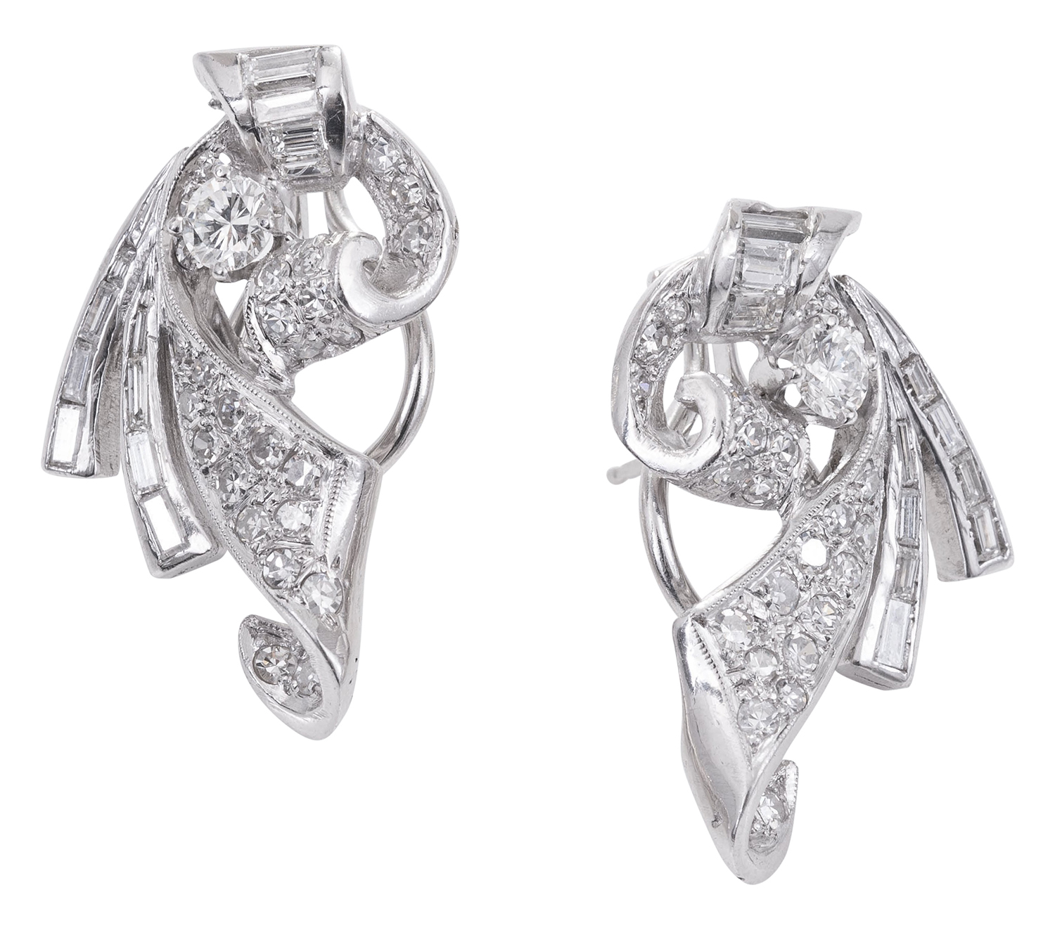 Of scroll design, each comprising round brilliant, baguette and single cut diamonds totalling 0.60cts, mounted in 18ct white gold.