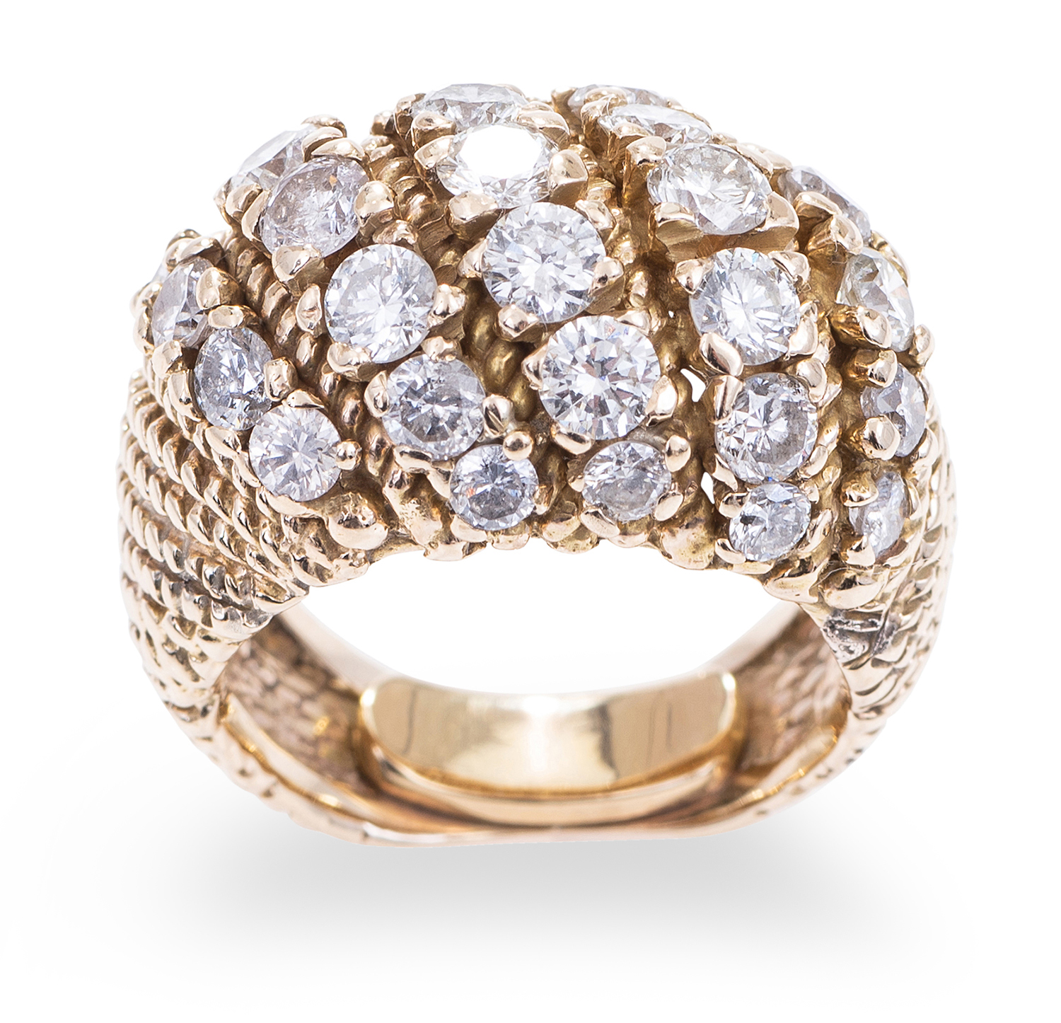 Comprising five graduated rows of round brilliant cut diamonds totalling 1.50cts, to a textured gold mount in 14ct gold, ring size H.