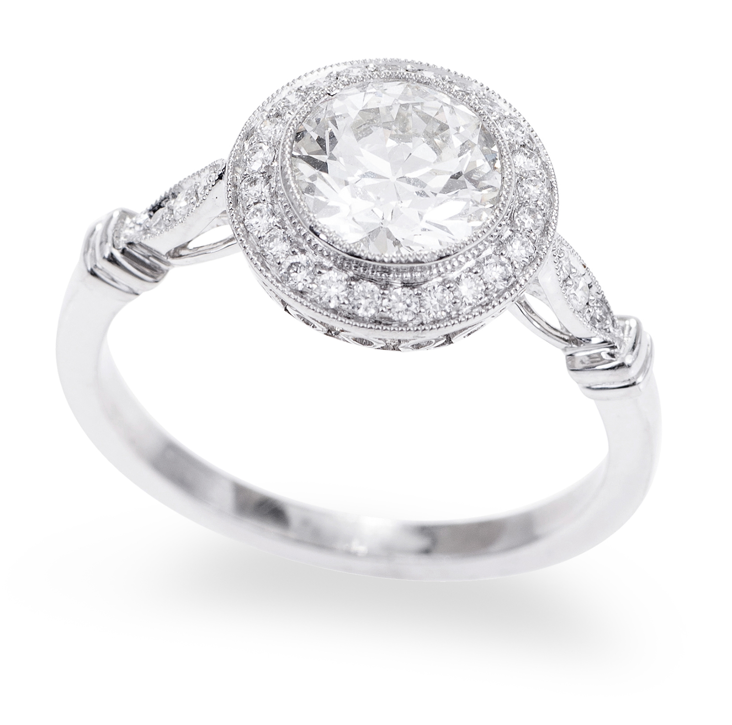Featuring a central early brilliant cut diamond of 1.25cts, grain set to a surround with round brilliant cut diamonds, mounted in platinum, ring size M.