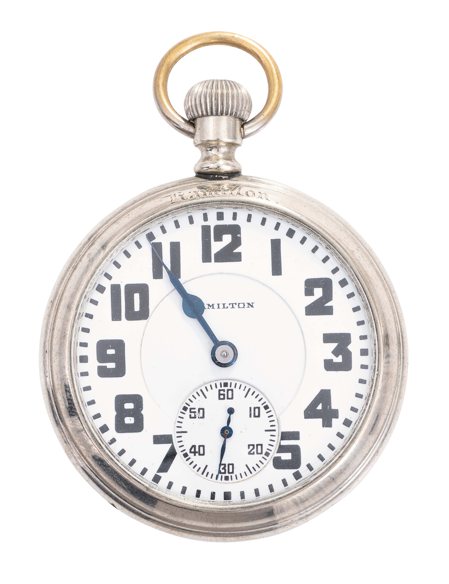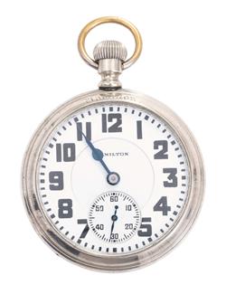 Not recently serviced or timed - Ticking when wound - Overall condition is very good - glass on display back is cracked & needs replacement - Bell worn- Clean dial - Movement signed Hamilton Watch Co, Lancaster, Pa 21 Jewels, double roller, 2489793.
