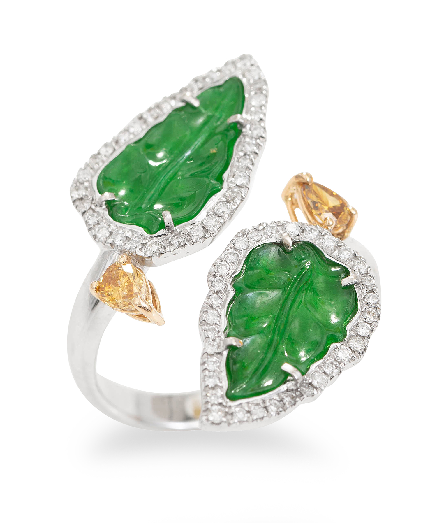 Of cross over design, the carved jade leaves surrounded by diamonds, with two feature pear cut yellow diamonds, mounted in 18ct white gold, ring size N, jade accompanied by a HKJS laboratory certificate stating Type A.