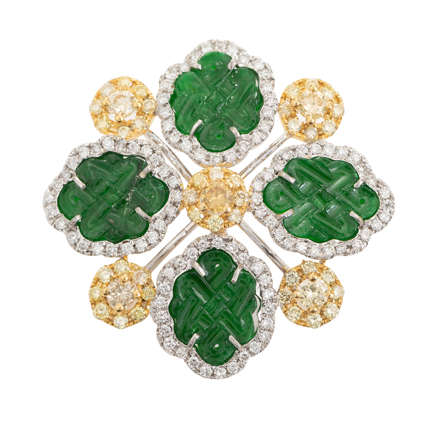 The four Jade leaves carved with 'eternity', bordered by round brilliant cut diamonds and yellow diamond clusters, mounted in 18ct white gold, accompanied by a HKJS laboratory certificate stating Type A.