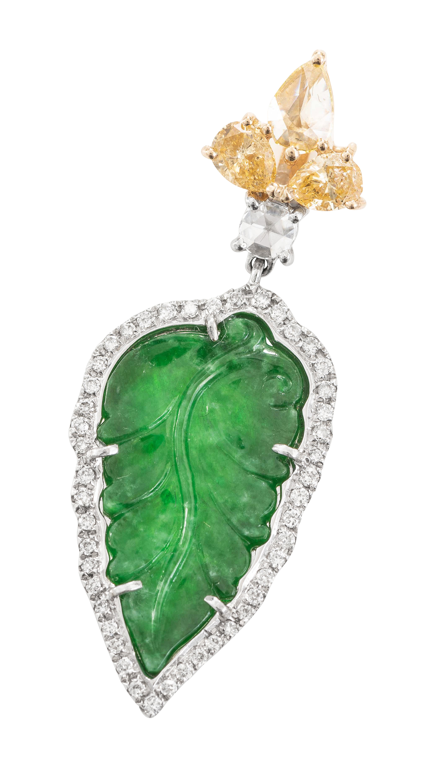 Featuring a carved Jade leaf surrounded by diamonds, to a yellow and white diamond bale, verso engraved with Chinese characters 'success for your business', mounted in 18ct white gold, jade accompanied by a HKJS laboratory certificate stating Type A.