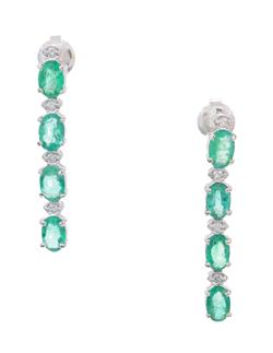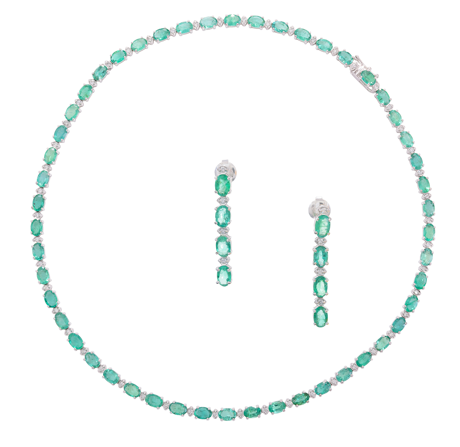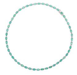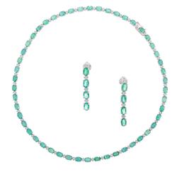 The necklace comprising fifty oval cut emeralds totalling 20.00cts, interspaced by diamonds totalling 1.00ct, mounted in 18ct white gold, with a pair of earrings of conforming design.