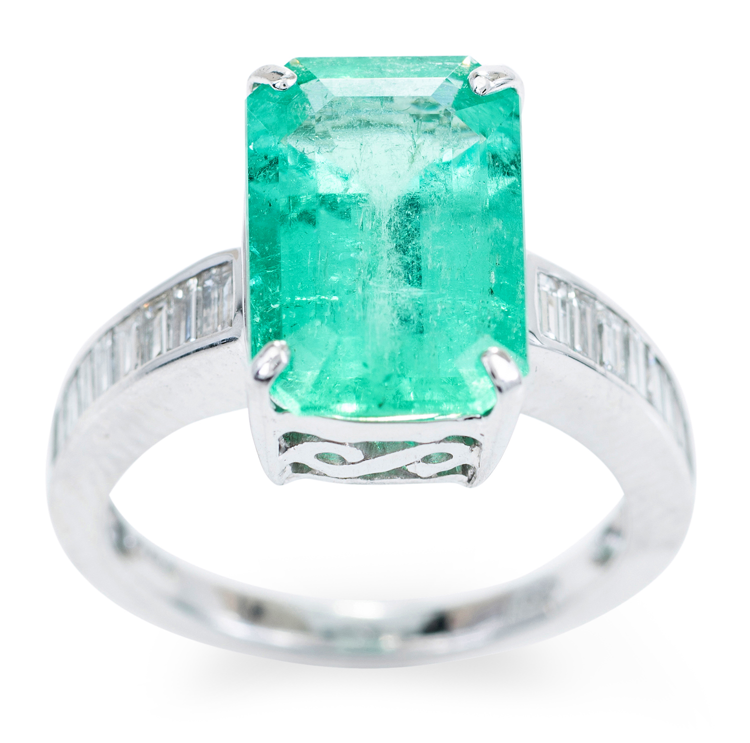 The ring presents in overall very good condition. All stones secure in the settings. Diamonds of good commercial colour and quality. Emerald is vivid light green, translucent with inclusions.