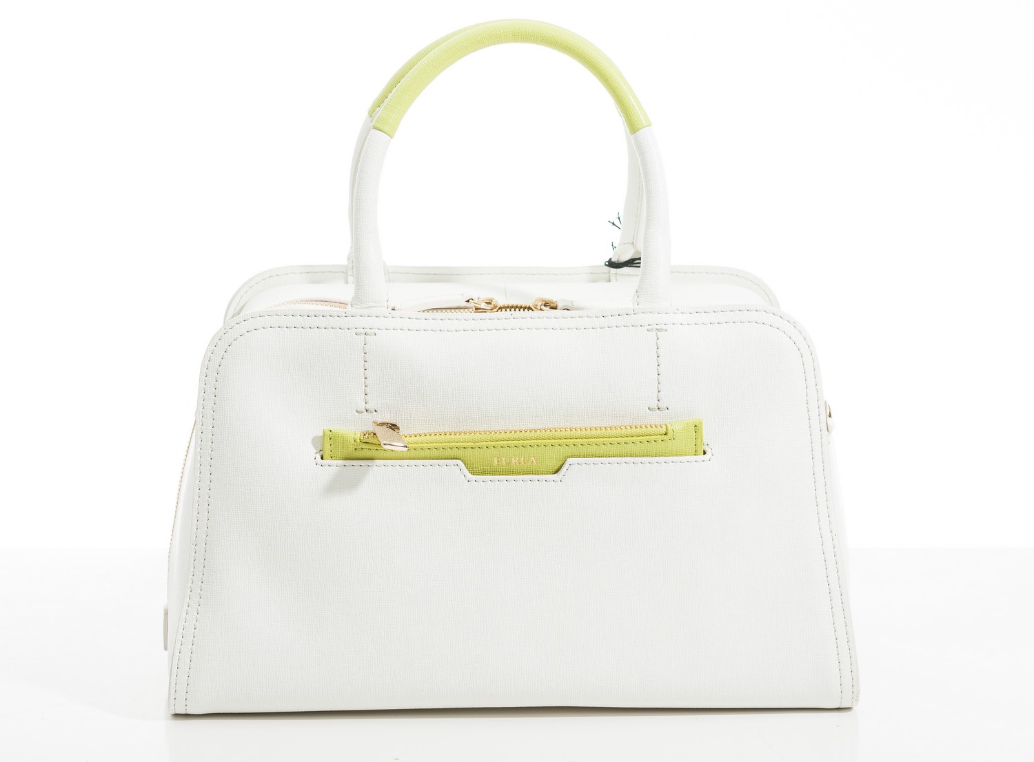 Styled in white leather with lime green handles and trim and gold metal hardware, original tags attached, 9 x 32 x 15cm.
