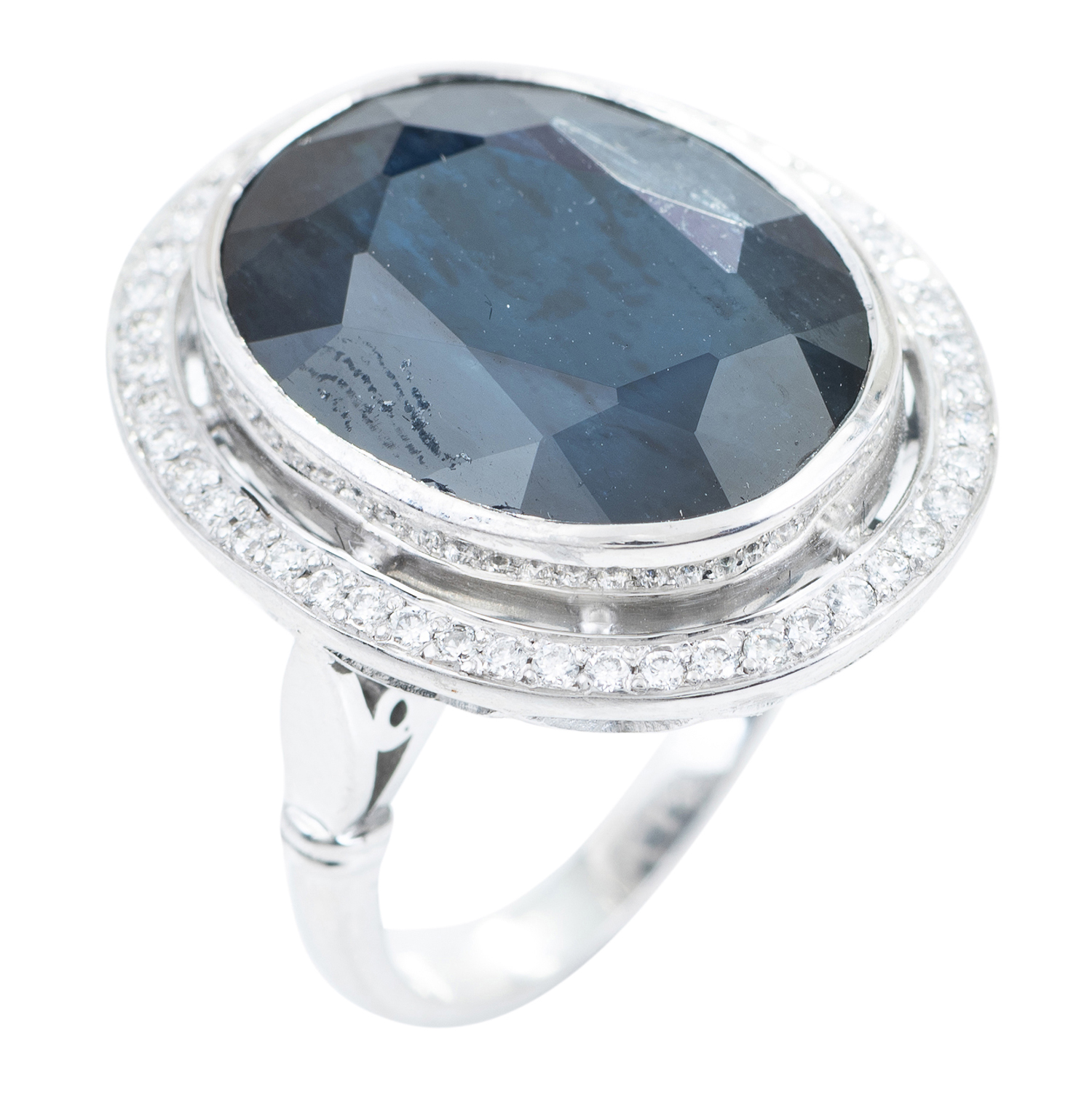Centrally set with an oval faceted sapphire of 19.12cts, surrounded by round brilliant cut diamonds totalling 0.38cts, mounted in 18ct white gold, ring size N.