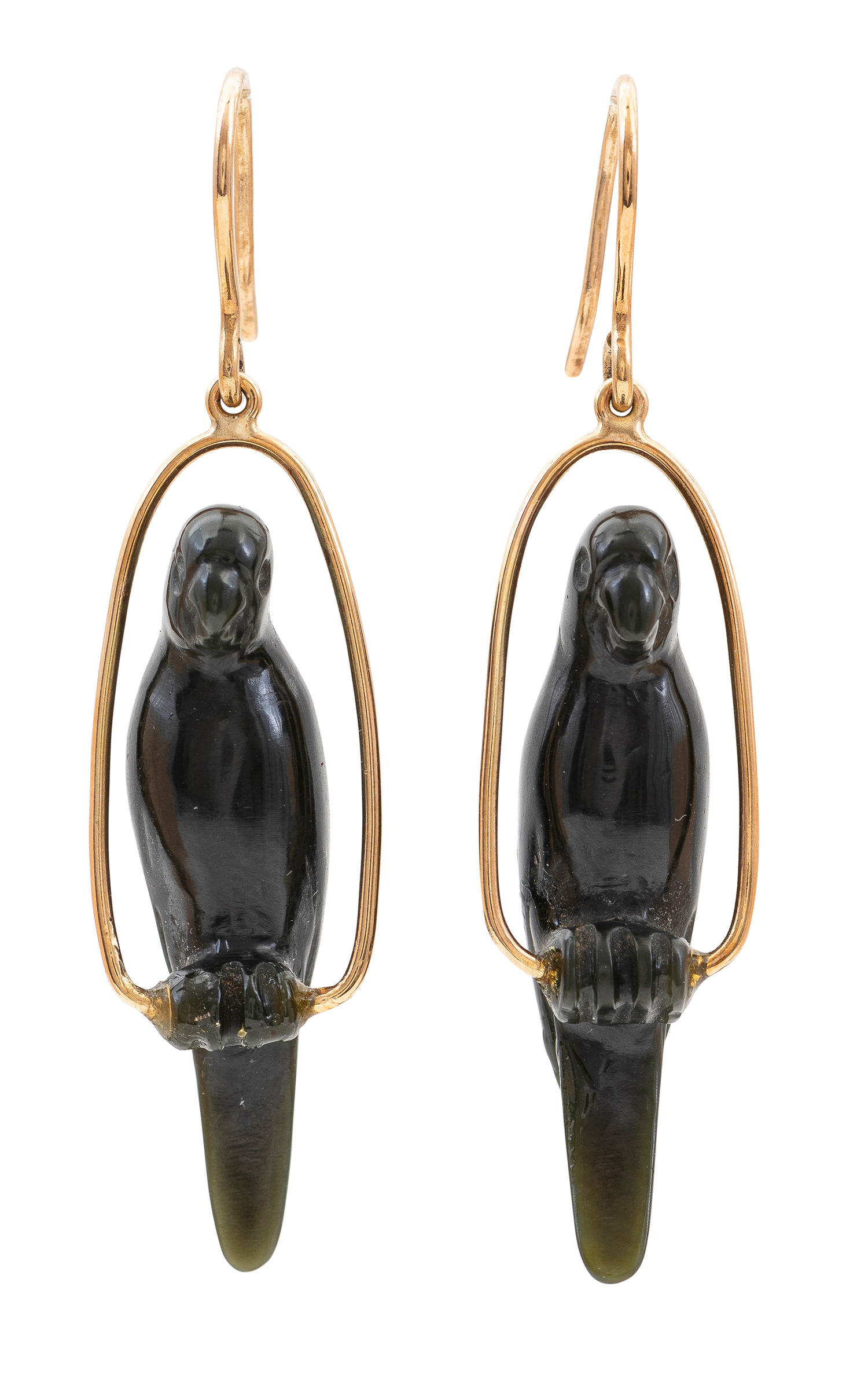 Each earring featuring a carved jade parrot on a gold perch, hand crafted by Tim Thompson in gold.