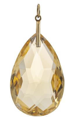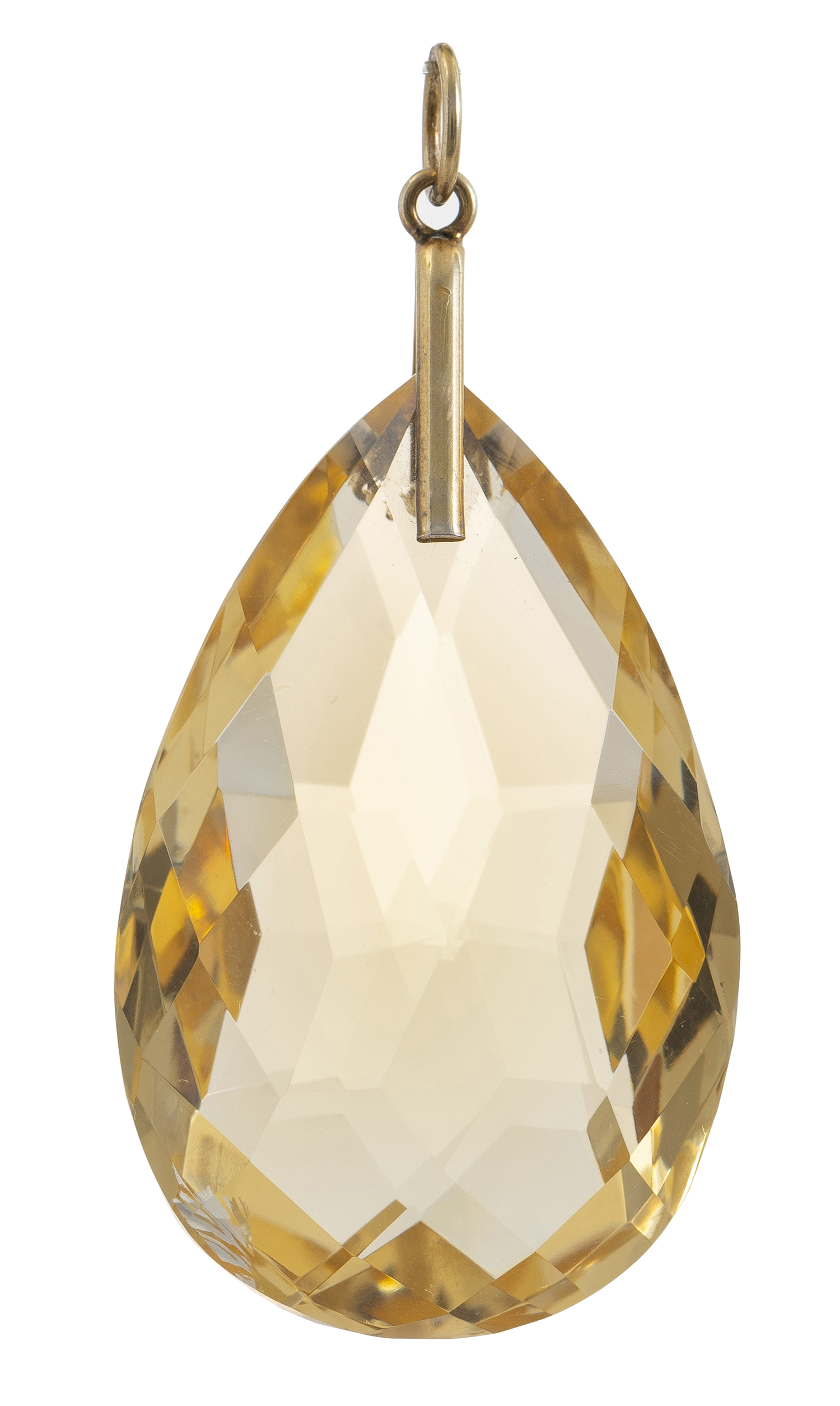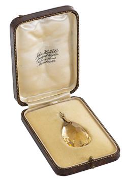 The pear cut faceted citrine, to a fixed gilded silver bale, retailed by John Hall & Co, King Street, Manchester, presented in original fitted box.