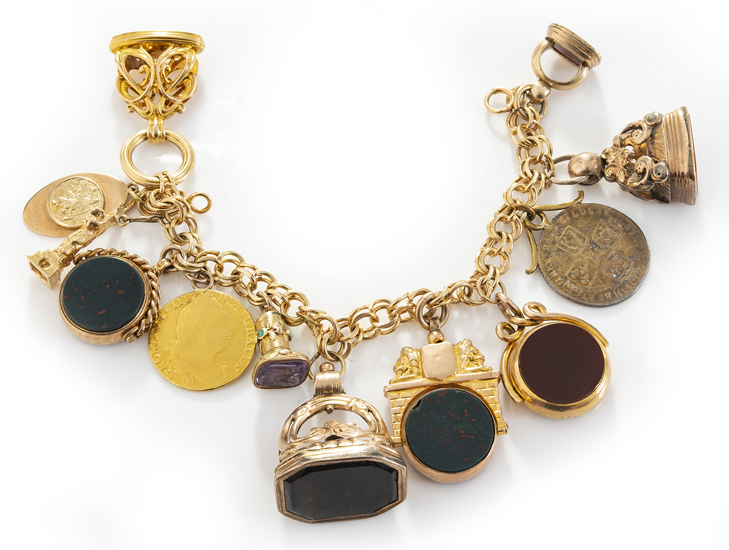 The fancy link bracelet in 18ct gold set with assorted charms, seals, spinners and coins, total length 180mm.