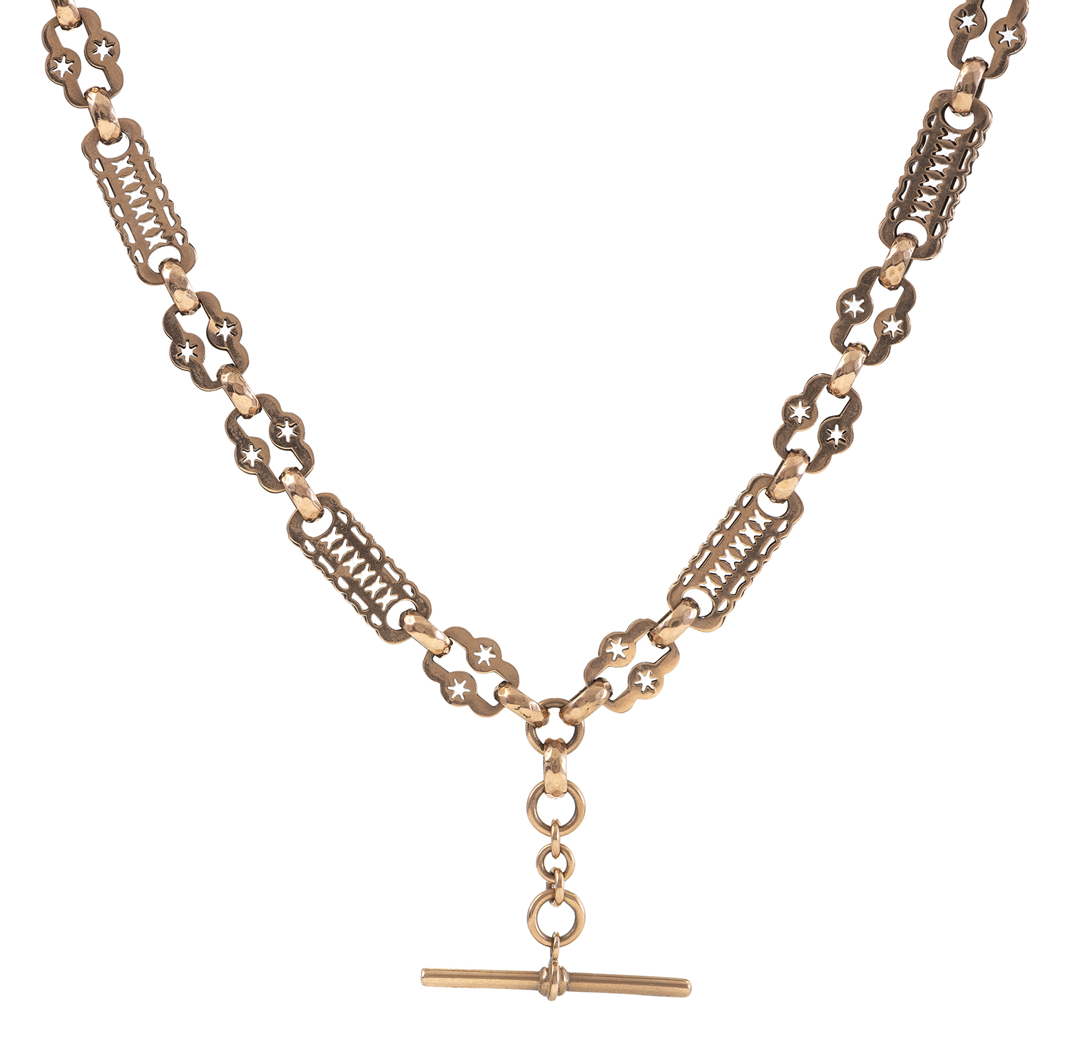 Comprising fancy pierced panel links with engraved detail to edges and pierced star motifs, with t-bar fitting, crafted in rose gold, hallmarked S.L. Edinburgh, total length 500mm.